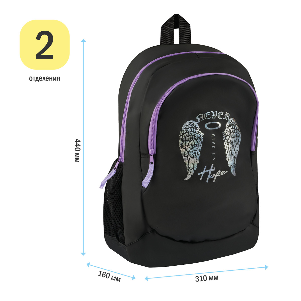 Рюкзак для средних и старших классов ArtSpace Classic Wings размером 45*30*16 см и объемом 21,6 литра с двумя отделениями, двумя сетчатыми карманами. Рюкзак сделан из водоотталкивающей ткани — полиэстера. Спинка и лямки уплотнены слоем спонжа толщиной 5 мм.