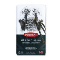 Набор содержит 12 карандашей Derwent Graphic : 6B, 5B, 4B, 3B, 2B, B, HB, F, H, 2H, 3H и 4H - весь средний диапазон твёрдости.