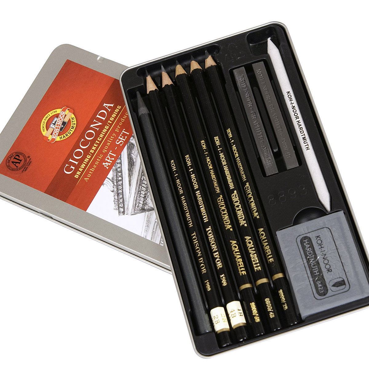 Художественный набор из 10 предметов для профессионального рисования, входящий в коллекцию "Gioconda" от чешской компании "Koh-I-Noor". Содержит все необходимое в компактном формате, позволяя заниматься искусством с максимальным комфортом. В набор входят: цельнографитный карандаш Progresso 8911/6В, два чернографитных карандаша 1900 2B и 4B, три черных акварельных карандаша Gioconda 2B, 4B и 6B, два брусочка художественного графита, растушевка, ластик-клячка (голубой 6421). Упаковка - металлический пенал. Артикул производителя - 8893000001PL.