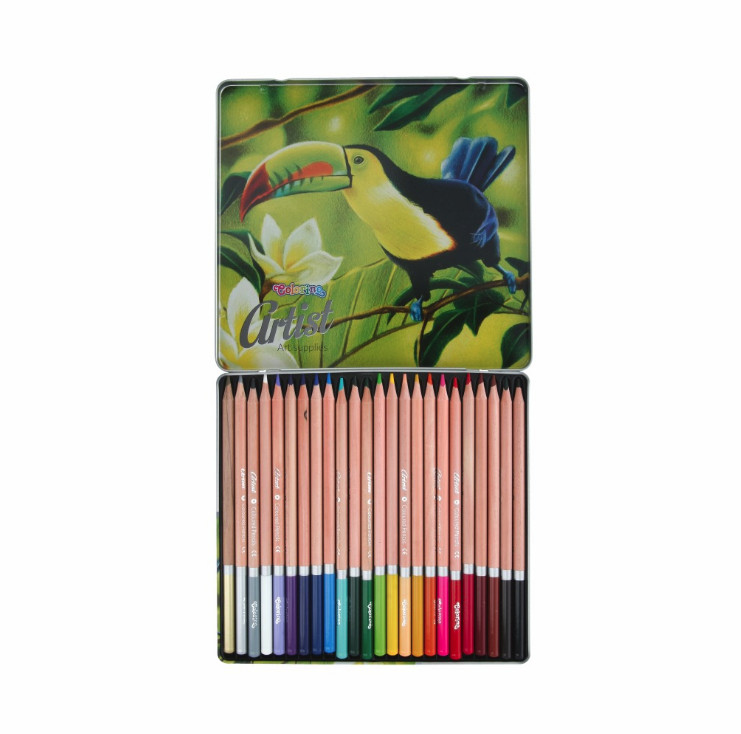 Линейка художественных материалов "Artist" от Colorino предназначена для любителей и профессионалов рисования в графической технике. Благодаря оптимальному сочетанию пигмента и связующего, карандаши обладают мягким грифелем, который даёт четкие насыщенные линии на бумаге различного типа, цвета легко смешиваются, обеспечивая возможность создания различных оттенков и плавных градиентов. Линейка представлена наборами карандашей различной комплектации. Данный набор состоит из 24 цветов, поставляется в металлическом пенале.