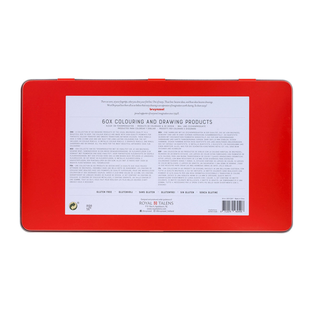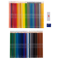 В набор входят: 44 цветных карандаша, 12 цветных карандашей "металлик" с корпусом из черной тонированной древесины, 2 чернографитных карандаша (твёрдостью НВ и 2В), ластик и точилка. Набор упакован в красочную металлическую коробку.