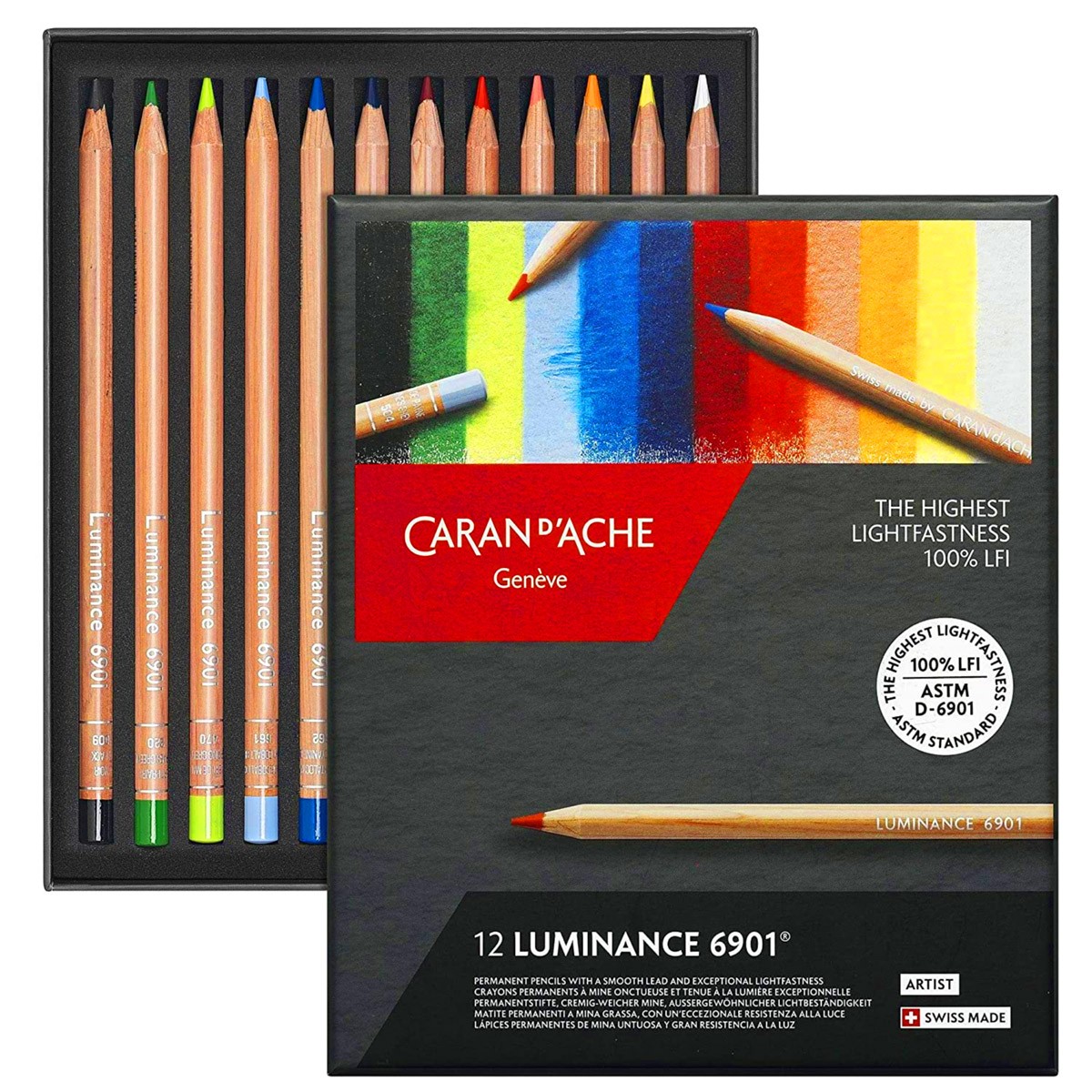 Цветные карандаши "Luminance 6901" от швейцарской компании Caran d’Ache отвечают самым высоким требованиям профессиональных художников и дизайнеров. Широкая цветовая гамма (76 оттенков), разработанна с использованием большого количества высококонцентрированных пигментов. Их светостойкость соответствует высшим международным стандартам (ASTM D-6901). Грифель 3.8мм - водостойкий, однородный, с максимальной укрывистостью, дающий яркие чистые цвета за счет высокой концентрации пигментов. Корпус - круглый, из лучшей древесины кедра, 8 слоев, с уплотнением на конце (того же цвета, что и грифель), с указанием названия цвета и кода. Эти мягкие карандаши особенно хороши для смешивания и растушевки, а также растушевки и полировки бесцветным карандашом. В набор входят 20 карандашей "Luminance 6901" (см. ниже таблицу цветов).