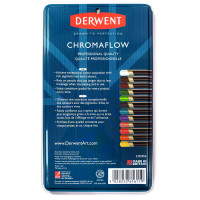 Палитра цветных карандашей Derwent Chromaflow включает в себя широкий спектр насыщенных, высокопигментированных оттенков. Мягкая кремообразная консистенция грифеля (3.5мм) обеспечивает отличную укрывистость, плавное нанесение цвета, облегчая смешивание, наложение слоев и растушевку. При правильной острой заточке грифель легко выдерживает сильный нажим и не ломается. Набор карандашей упакован в красивую и прочную жестяную коробку. В набор входят 12 цветов: Sun Yellow, Flame, Scarlet, Blush Pink, Lilac, Denim, Blue, Basil, Grass Green, Natural Brown, Black, White.