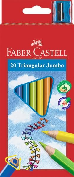 Утолщенные цветные трехгранные карандаши Jumbo от Faber-Castell Junior откроют юным художникам новые горизонты для творчества, а также помогут отлично развить мелкую моторику рук, цветовое восприятие, фантазию и воображение. Благодаря трехгранной форме они особенно удобны для детской руки. Корпус каждого карандаша изготовлен из особой мягкой древесины, что является гарантией легкого затачивания при помощи стандартных точилок. Специальная SV технология вклеивания грифеля предотвращает его поломку при падении на пол. Корпус покрыт лаком на водной основе - бережным по отношению к окружающей среде и здоровью детей. Мягкий, насыщенный пигментом, толстый грифель (3.8мм) без усилий идёт по бумаге, оставляя яркий чистый след. В набор входят 20 карандашей и точилка. Карандаши уже заточены.