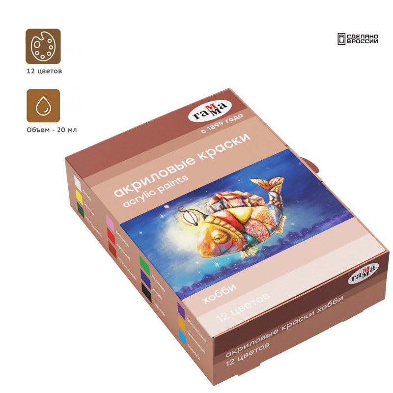 Глянцевые декоративные акриловые краски серии "Хобби" от фирмы ГАММА предназначены для декоративно-оформительских работ и росписи по любой поверхности (бумага, картон, холст, дерево, металл, гипс). Краски обладают высокой укрывистостью, хорошо смешиваются, быстро высыхают. После высыхания приобретают глянцевый блеск. Благодаря удобной герметичной баночке с завинчивающейся крышкой, краски долго хранятся, не высыхая. Морозостойкие. Объем баночки - 20 мл. В набор входят 12 цветов: белый, жёлтый, изумрудный, розовый, красный, коричневый, зелёный, синий, чёрный, фиолетовый, оранжевый, голубой.