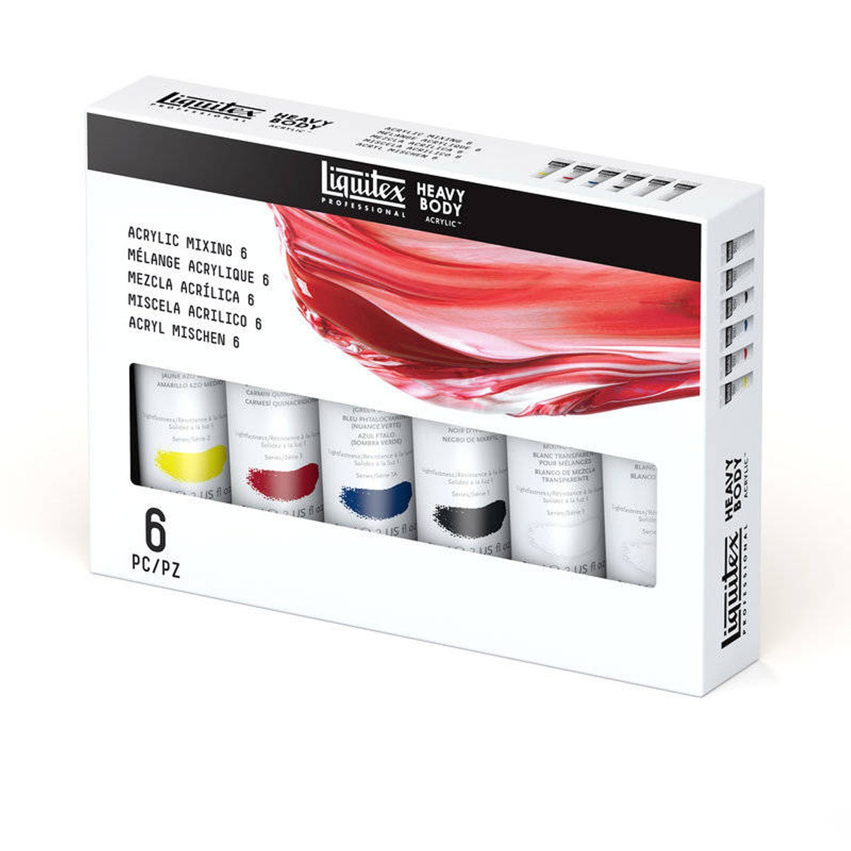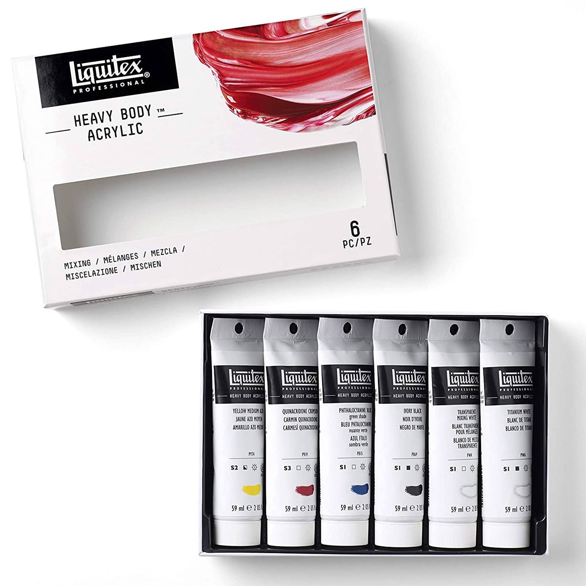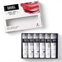 Профессиональные акриловые краски "Heavy Body" от американской компании Liquitex – это плотные, высокопигментирированные акриловые краски, которые идеально подходят для придания работе текстуры и фактуры. Высокая концентрация светостойких пигментов дает насыщенные, глубокие и интенсивные цвета, а высокая плотность краски позволяет сохранять структуру мазков - как от кисти, так и от мастихина. Цветовая палитра - 105 оттенков. Все цвета хорошо смешиваются между собой. При производстве красок "Heavy Body" используются новейшие технологии: основа из акриловой смолы со слабым запахом дает увеличенное время высыхания и обеспечивает прекрасную чистоту и яркость цветов с минимальным переходом тона от влажного к сухому. Красочная пленка - очень гибкая, прочная, не трескается, не желтеет, устойчива к ультрафиолету и водонепроницаема после высыхания. Также эти краски - безопасны и безвредны и, практически все, имеют знак одобренной безопасности (AP). В набор "Mixing 6" входят 6 тюбиков по 59мл следующих цветов: 110 Хинакридон малиновый, 412 Желтый средний Azo (имит.), 316 Синий ФЦ (зеленый оттенок), 432 Белила титановые, 430 Белила микс прозрачные, 244 Кость жженая.