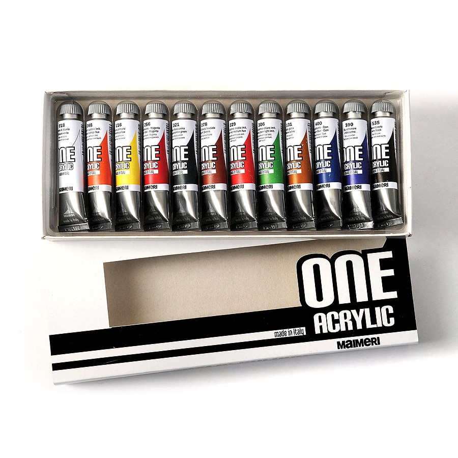 В состав набора красок "ONE" от "Maimeri" входят 12 тюбиков по 20мл двенадцати цветов: