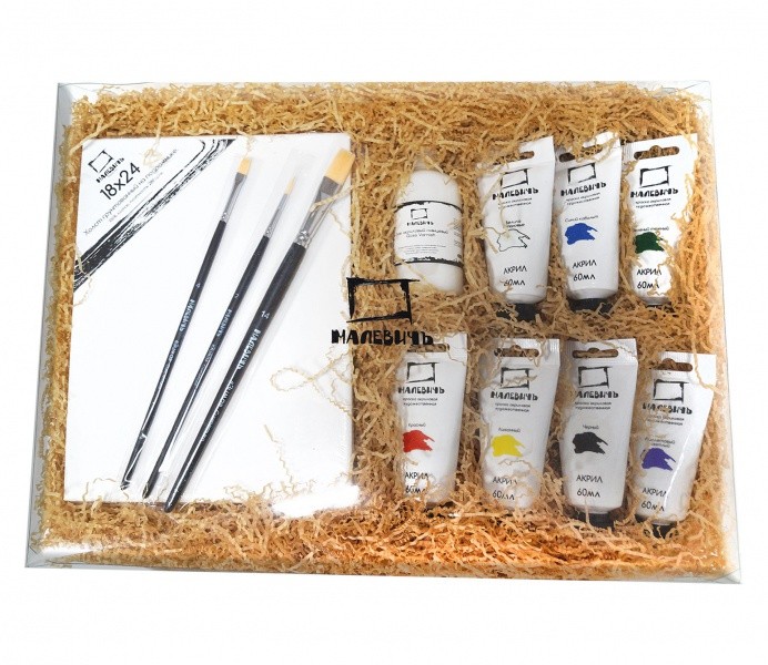 Набор с акриловыми красками "Большой" от компании "Малевичъ" это - прекрасный подарок начинающему или опытному художнику, ведь в него входит все необходимое, чтобы немедленно приступить к работе: несколько видов загрунтованных холстов на картоне и подрамнике, три профессиональные кисти разной формы и размера, семь больших тюбиков акриловых красок наиболее популярных цветов и финишный лак. Набор упакован в прозрачную пластиковую коробку с декоративной стружкой. Состав набора: