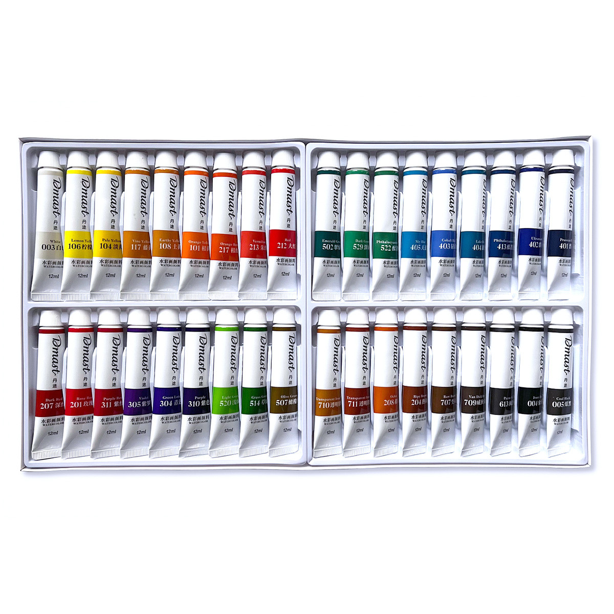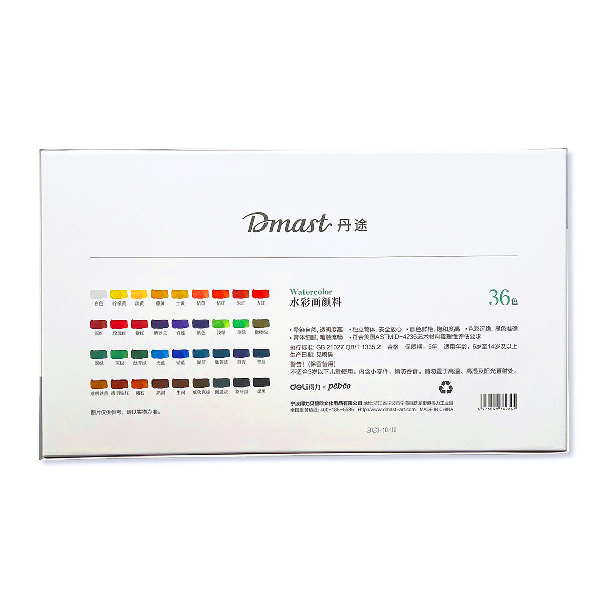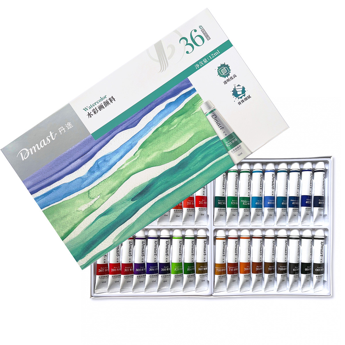 Акварель Dmast произведена из натурального гуммиарабика и пигментов тончайшего помола (размер частиц менее 1 микрона). Цветовая палитра включает в себя исключительноо чистые цвета с высокой светостойкостью. Каждая партия проходит экспертизу в лаборатории цвета на соответствие эталону. Упаковка набора произведена из прочного картона с приятным на ощупь покрытием Soft-touch. Внутри коробки установлены пластиковые подложки для раздельного хранения туб. Тубы 12мл произведены из плотного пластика, снабжены удобными завинчивающимися крышечками.
