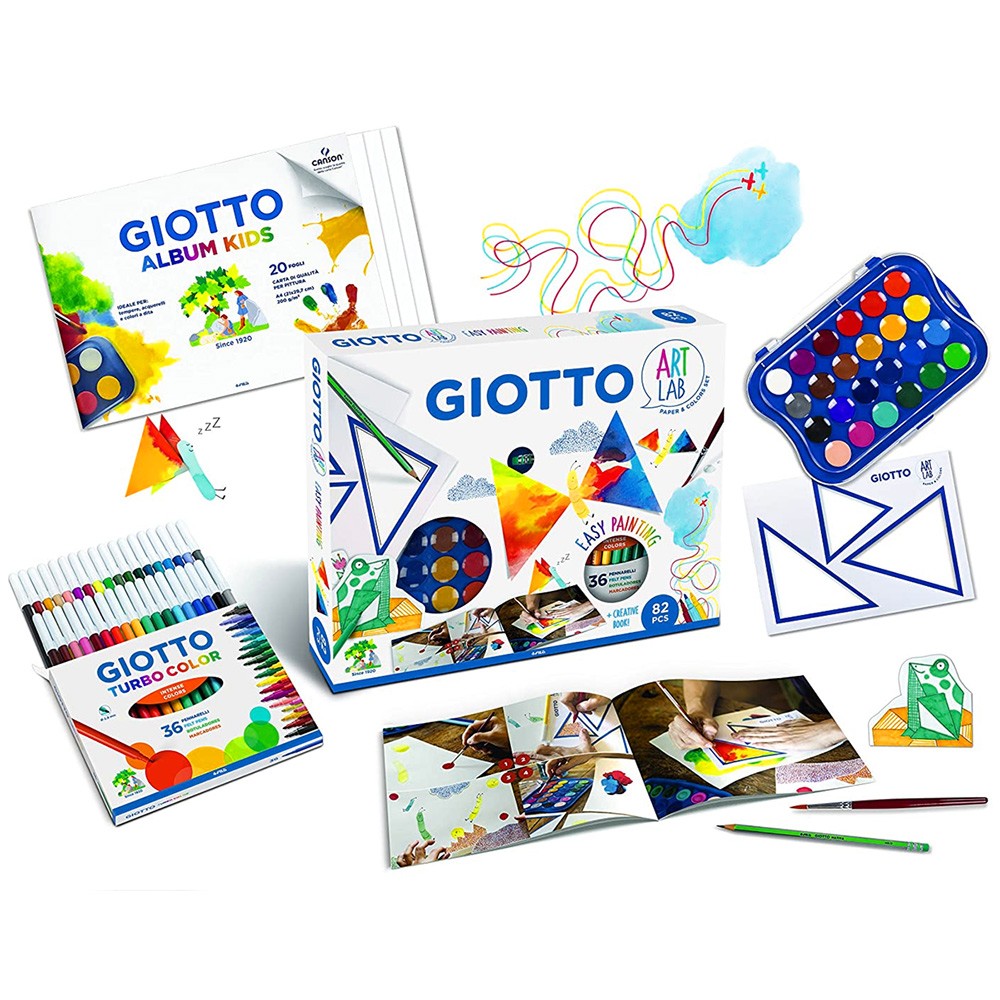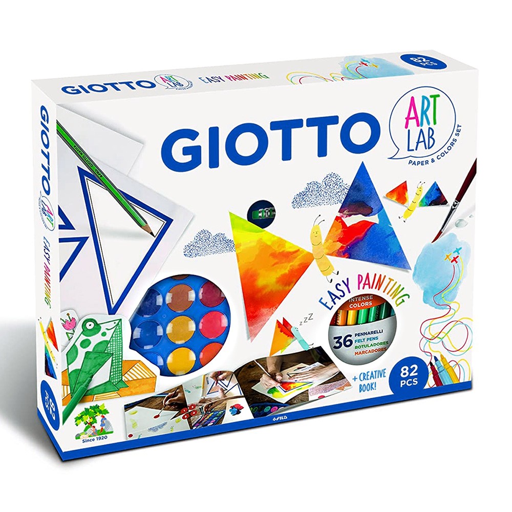 Набор для рисования "Easy Painting" содержит: 36 фломастеров Giooto Turbo Color, трафарет для рисования, акварель в таблетках 24 цв Giotto Watercolours mimi, детский альбом формата A4 с белой качественной бумагой плотностью 200г/м2, 1 чернографитный карандаш твердостью HB, синтетическую кисть для акварели. К набору прилигается красочная инструкция.