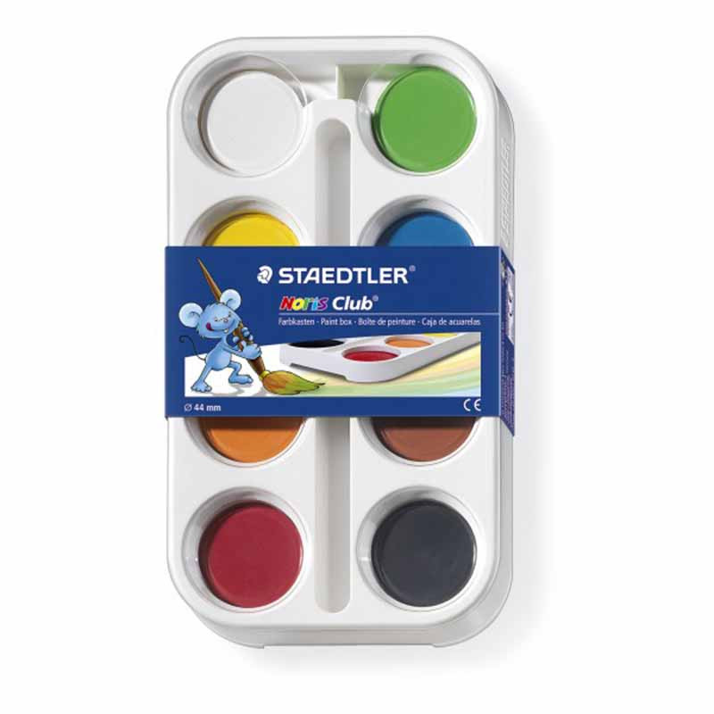 Краски высокого качества, в пластиковом корпусе с прозрачной крышкой. Краски-таблетки большого диаметра (44 мм.). Восемь сочных, ярких цветов хватит надолго. Удобная крышка служит палитрой для смешивания красок. Производитель: STAEDTLER ( Германия)