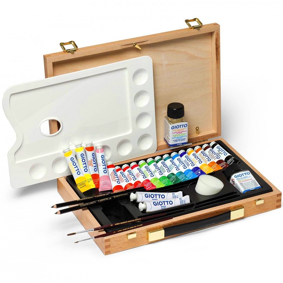 Художественный набор красок Giotto Wooden Case Professional в деревянной коробке. В набор входит 28 предметов: краска гуашь в тюбиках 2шт по 21 мл, 18 шт по 7,5 мл, 2 кисточки, 2 темно-серый карандаша, 1 пластмассовая палитра, 1 флакон лака, 1 флакон фиксатора, 1 спонжик.