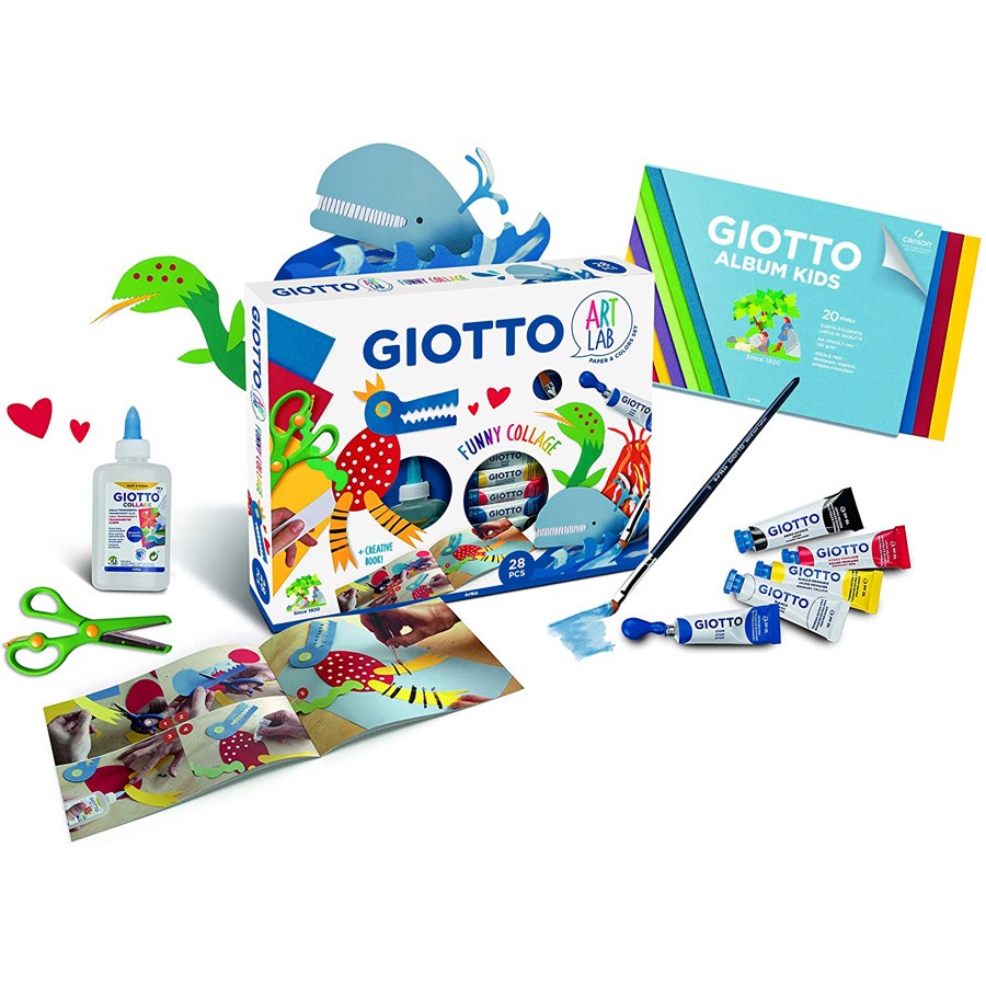 Набор "Весёлый коллаж" Giotto Art Lab содержит 28 предметов: гуашь Giotto Tempera Fine 5 цветов по 10мл., клей Giotto Collage Glue 120гр., ножницы, набор цветной бумаги 20 листов, кисть, инструкцию.