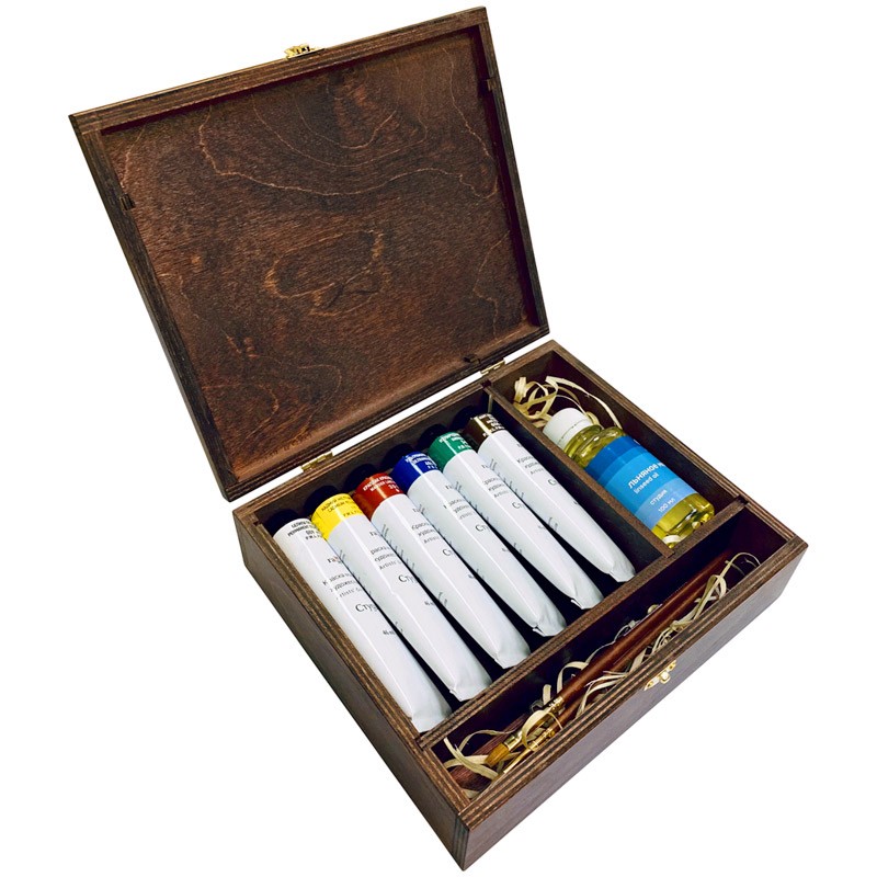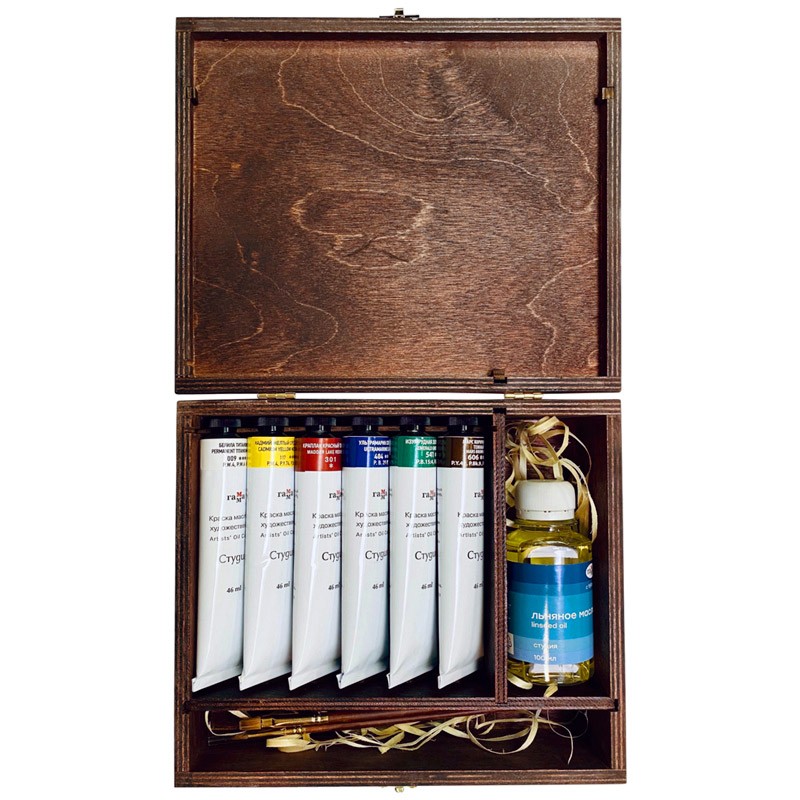 Набор масляных красок ГАММА "Студия" в деревянной шкатулке станет отличным подарком. В наборе: 6 цветов масляных красок в тубе 46 мл, 2 кисти из натурального ворса колонка, льняное масло. Масляные краски "Студия" рекомендованы для обучения живописи и начинающих художников. Краски изготовлены на основе безопасных пигментов. Деревянный пенал может использоваться для хранения художественных материалов.