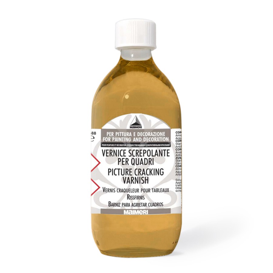 Кракелюрный лак на водной основе №688 от итальянской компании "Maimeri" используется для получения трещин "под старину". Кракелюрный лак наносится поверх не просушенного до конца патинирующего лака Maimeri №678. К моменту полного высыхания обоих лаков на поверхности образуются трещины, которые необходимо проявить - тонировать (затереть) каким-либо красящим средством, контрастирующим по цвету с общим тоном работы. Для придания еще большей "старинности" можно снова нанести патинирующий лак Maimeri №678. Далее следует покрыть всю работу защитным лаком. Данная пара (Патинирующий лак №678 + Кракелюрный лак №688) широко используется в декупаже. Внимание: на размер трещин влияют температура и влажность окружающей среды!