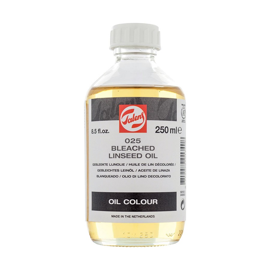 Масло льняное отбеленное Royal Talens (025) используется, чтобы увеличить прочность и эластичность пленки, образующейся при высыхании красочного слоя. Также может быть использовано как связующее при самостоятельном изготовлении красок. Состав: отбеленное льняное масло. Значительно увеличивает время высыхания красок и блеск красок. Увеличивает риск сморщивания красочного слоя. Незначительно желтеет, при дневном свете пожелтение исчезает. Излишки масла можно убрать уайт-спиритом или терпентином.