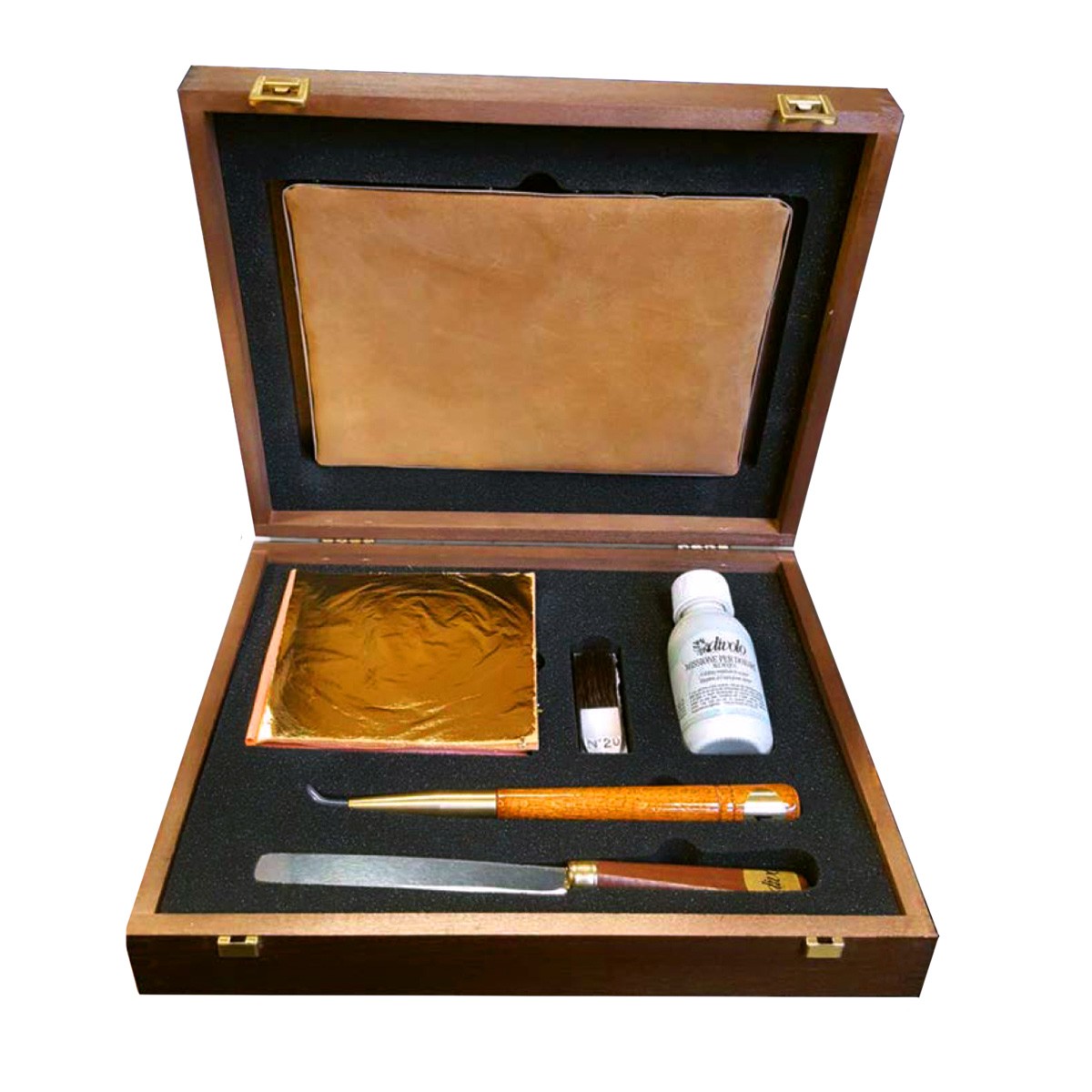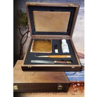 Набор позолотчика в красивом деревянном кейсе от итальянской марки Divolo включает в себя всё самое необходимое для работы: клей для золочения водный (125мл), поталь (имитация золота) в листах, кисть для переноса потали, агатовый зубец для полировки, нож позолотчика и подушку из натуральной замши. Размеры кейса - 33x28x7,5см.