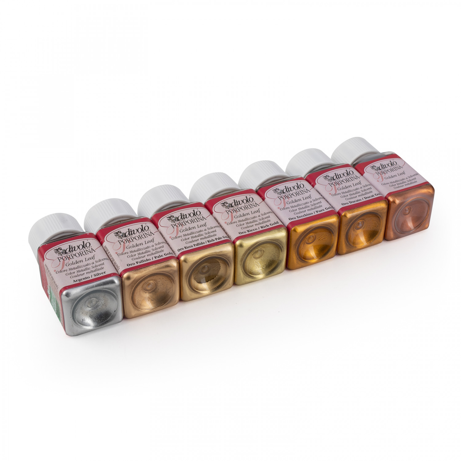 Жидкая поталь ("жидкая бронза" или "поталь-краска") итальянской марки Divolo изготовлена на основе растворителя и металлизированного пигмента. Возможно наносить кистью, валиком, а также подходит для распыления. Используется для металлического декорирования любых поверхностей. Пленка обладает хорошей устойчивостью даже во внешней среде. Продукт может быть использован в качестве финального/защитного слоя или же непосредственно при декорировании. В начале работы - удалите пыль с поверхности. Перед использованием продукт необходимо тщательно взболтать из-за оседания металлического порошка на дне, при необходимости используйте зубочистку, чтобы лучше перемешать краску в бутылке. Нанесите на поверхность с помощью кисти или распылителя, дать высохнуть. При необходимости повторите еще раз. Отличный металлический блеск. Превосходная стойкость к позеленению. Разбавляется ацетоном или спиртом 1:1. (РЕКОМЕНДУЕТСЯ ПРОВЕСТИ ТЕСТИРОВАНИЕ НА НЕБОЛЬШОМ УЧАСТКЕ.) В линейке представлено семь вариантов цвета во флаконах по 50 мл.