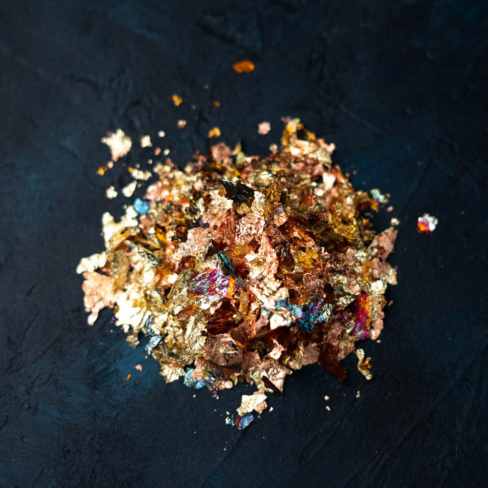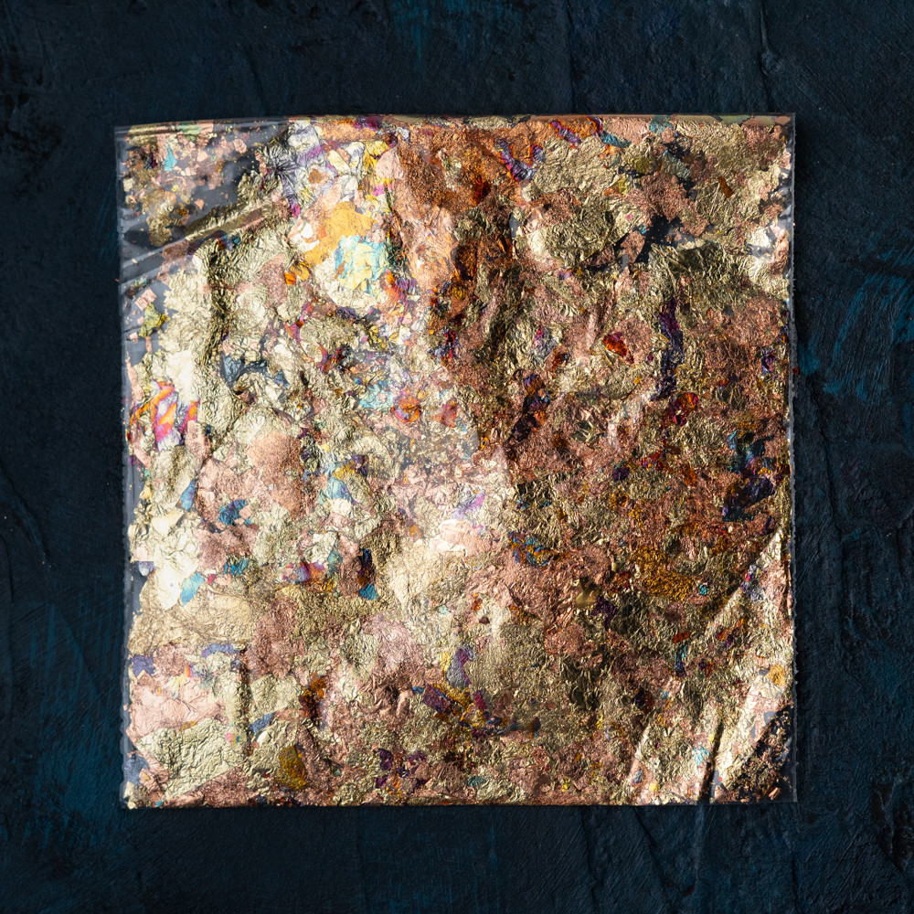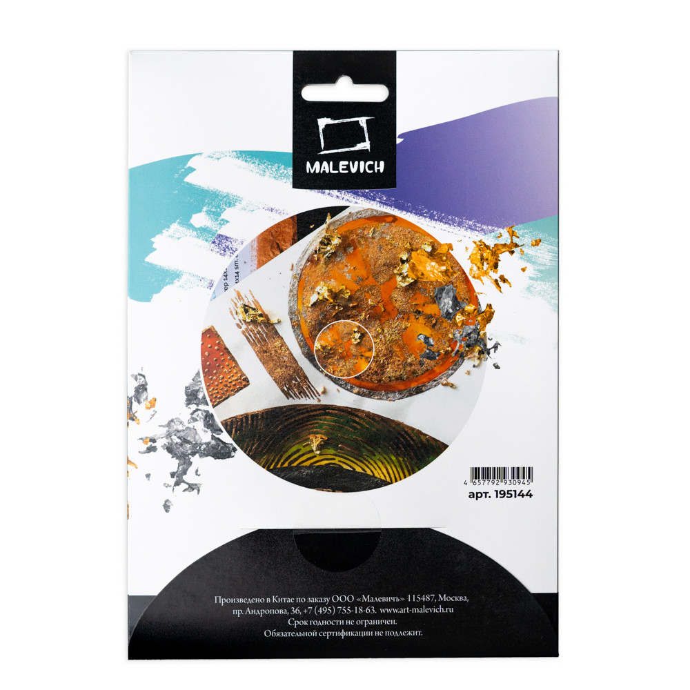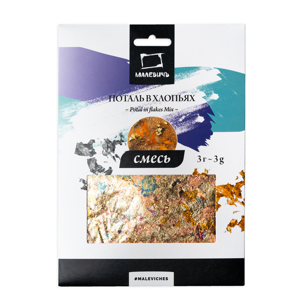 Поталь Малевичъ в хлопьях – это небольшие фрагменты тончайшей металлической фольги, предназначенные для декорирования изделий из различных материалов: из гипса, дерева, глины и т.п. Также хлопья потали позволяют экспериментировать в живописи и графике, в работе с эпоксидной смолой и даже в создании маникюра. (Внимание! Поталь в хлопьях не является съедобной и не подходит для украшения кулинарных изделий.) Хлопья потали рекомендуется наносить на липкий ровный слой мордана, посыпав ими декорируемую поверхность. После нанесения поталь необходимо прижать - руками в перчатках, мягкой кистью или мягкой тканью, не оставляющей ворсинки. Использование хлопьев позволяет добиться полного покрытия декорируемой поверхности - без разрывов и трещин. Излишки потали удаляются кистью. После высыхания поверхность полируется мягкой тканью. Готовое, задекорированное поталью изделие, обязательно покрывается защитным лаком. Для работы рекомендуется использовать только специальные клей и лак для золочения, чтобы поталь не потускнела и не потеряла свой цвет.