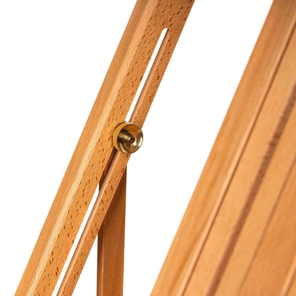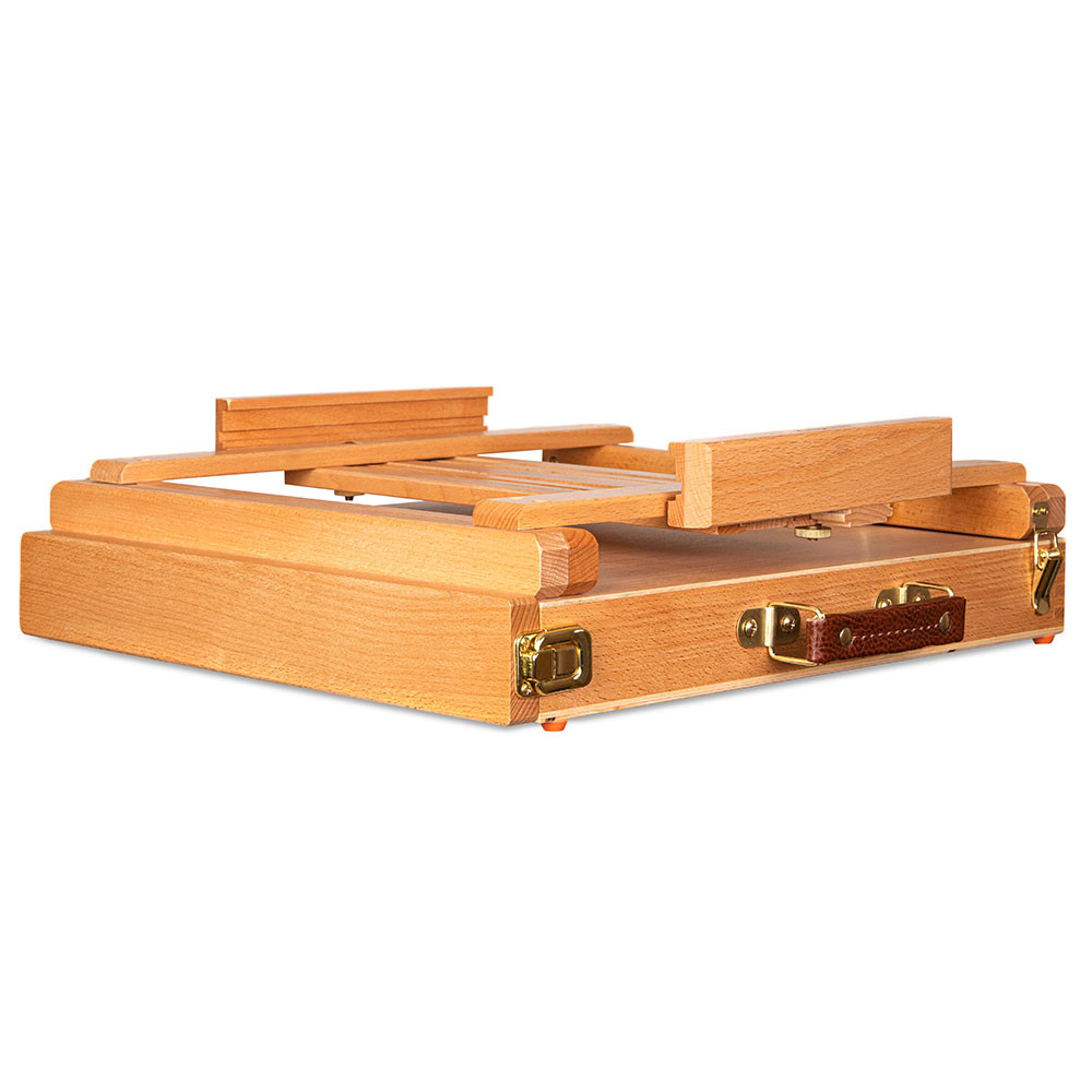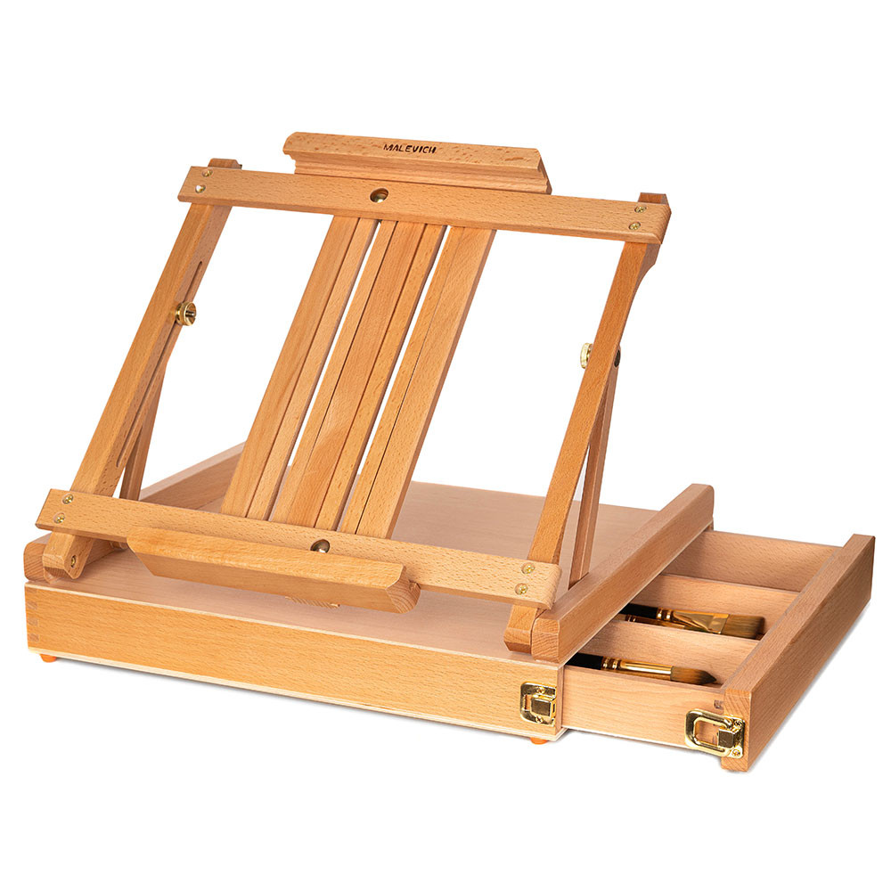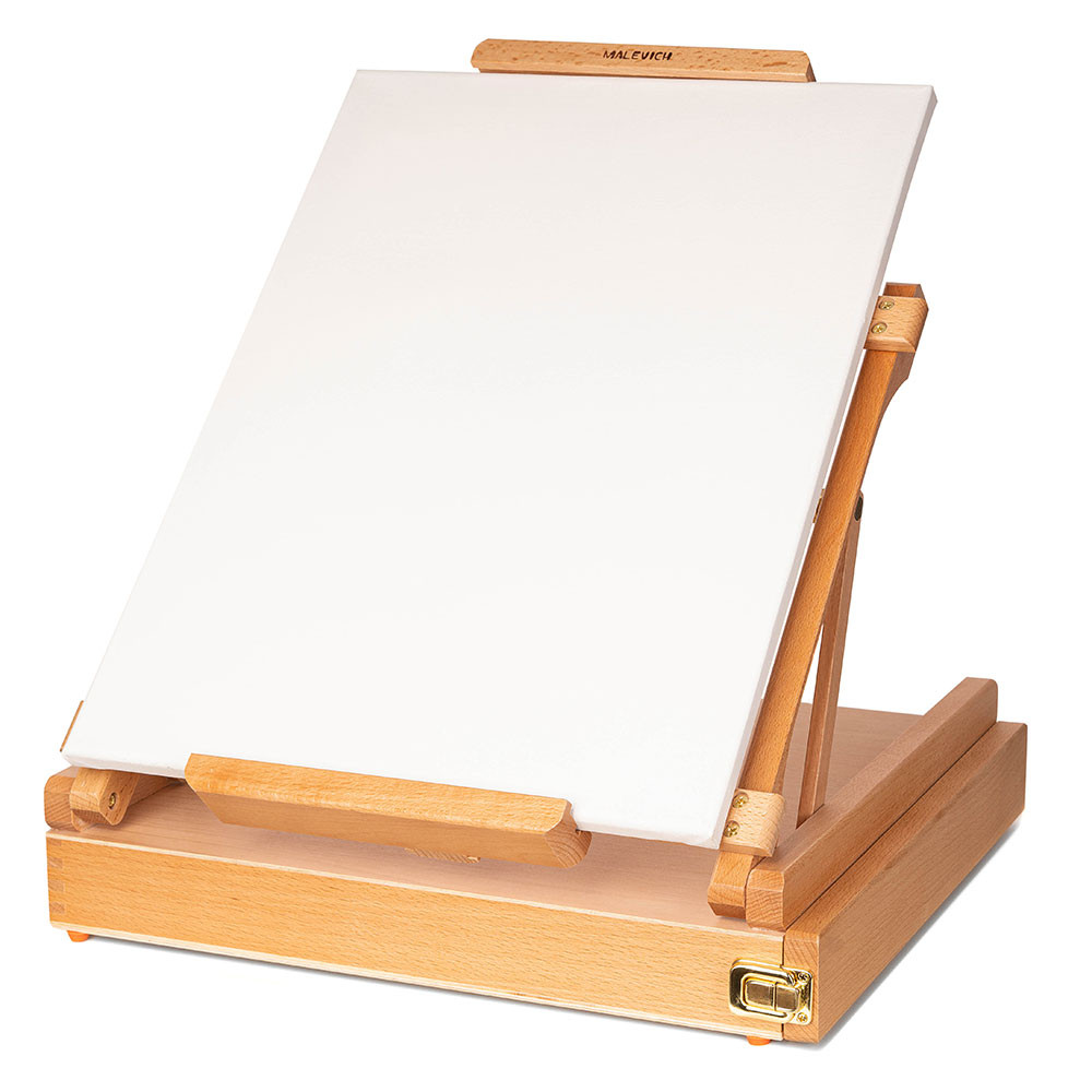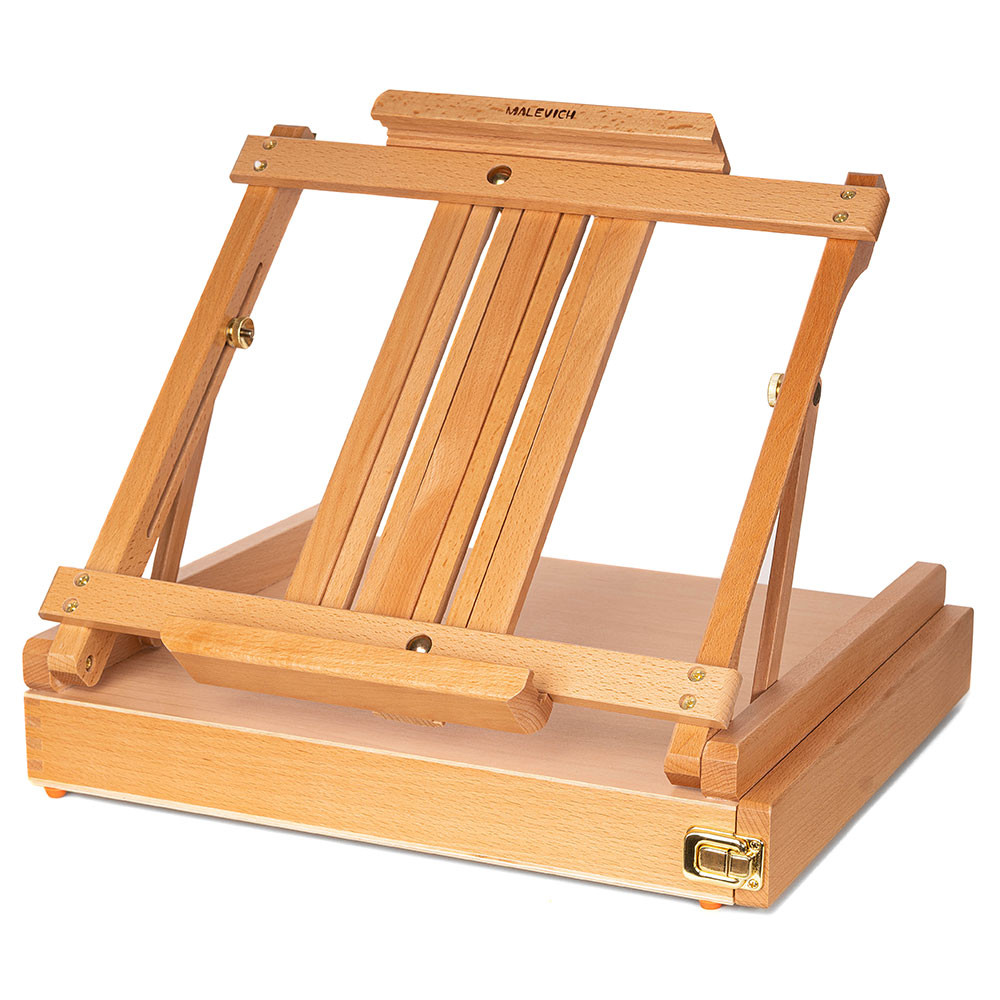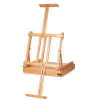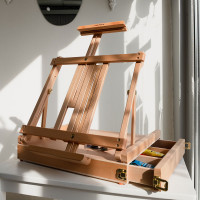 Настольный мольберт с выдвижным ящиком (выдвигается вбок). Подходит для всех видов работ на холсте, а также на бумаге (с планшетом). Держатели холста выдвигаются и вверх, и вниз. Это позволяет работать на холстах большого размера. Ширина - 42см, глубина - 38см, высота - 65см. Высота с сложенном виде - 13см.