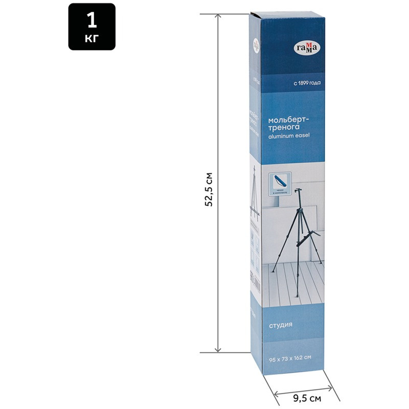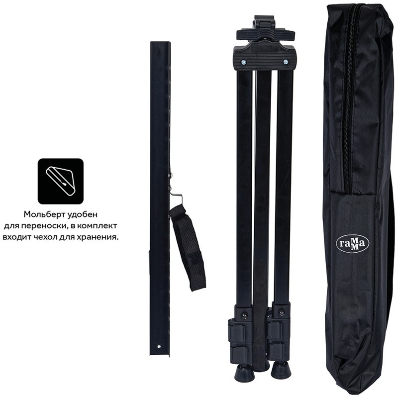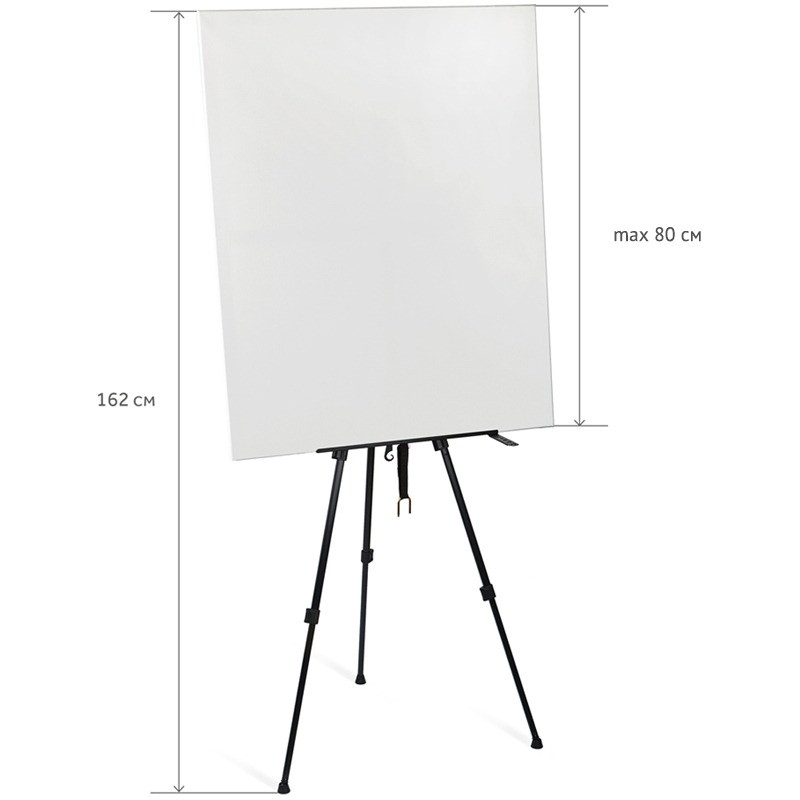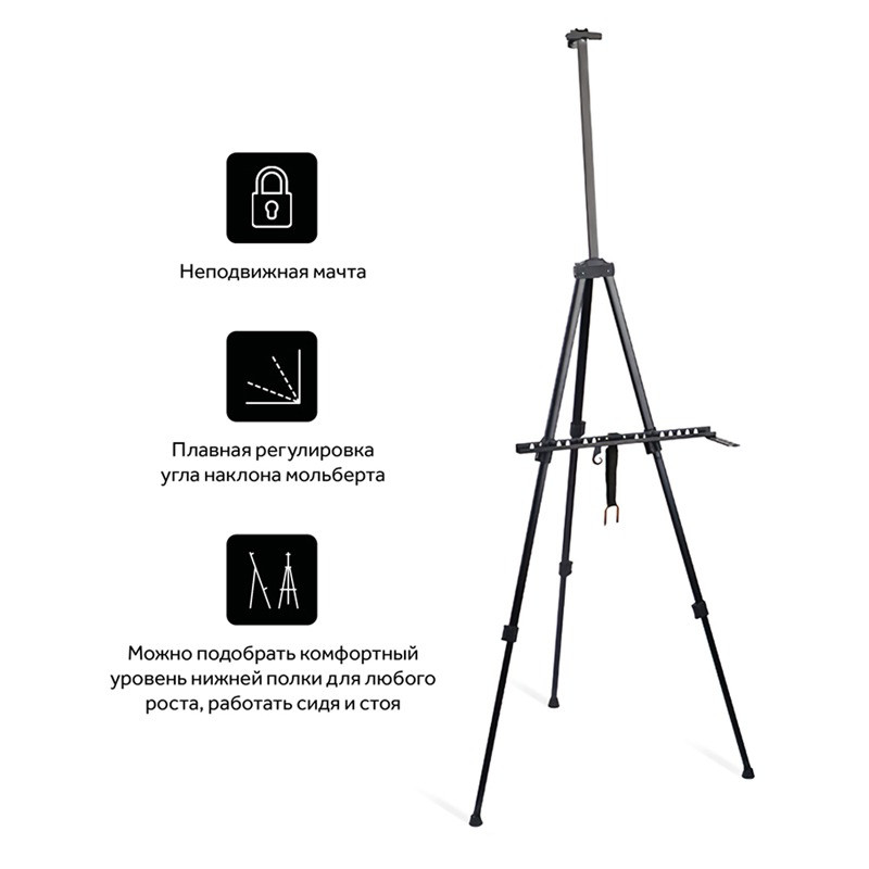 Переносной мольберт-тренога из алюминия, черный. Лёгкий, компактный, прочный — выдерживает вес до 25 кг. Может использоваться, как на пленэрах, так и для работы в студии. Легко складывается, удобен для переноски (в комплект входит чехол для хранения). На мачте расположен бегунок для фиксации планшета или холста. Оснащен съемной полкой, крючком и подставкой для кистей. Удобная регулировка высоты мольберта за счет изменения высоты телескопических ножек. Со сложенными ножками может использоваться как настольный мольберт. Максимальная высота мольберта - 162 см, максимальный размер холста для работы - 80 см. Вес - 0,8 кг.