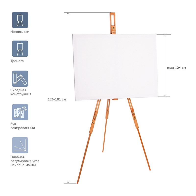 Полевой мольберт-тренога с подвижной штангой, из натурального лакированного бука. Может использоваться, как на пленэрах, так и для работы в студии. Легко складывается, удобен для переноски (в комплект входит ремень). На мачте расположен бегунок для фиксации планшета или холста, нижний край мачты с упором, также ножки мольберта оборудованы упорами. Удобная регулировка высоты мольберта за счет изменения высоты ножек. Максимальная высота мольберта - 181 см, максимальный размер холста для работы - 104см.