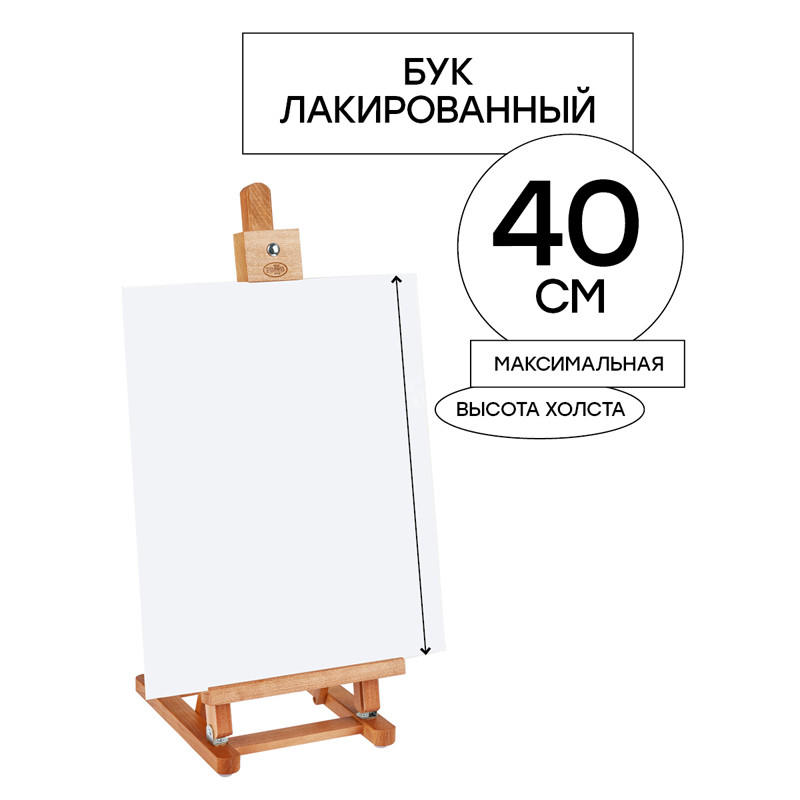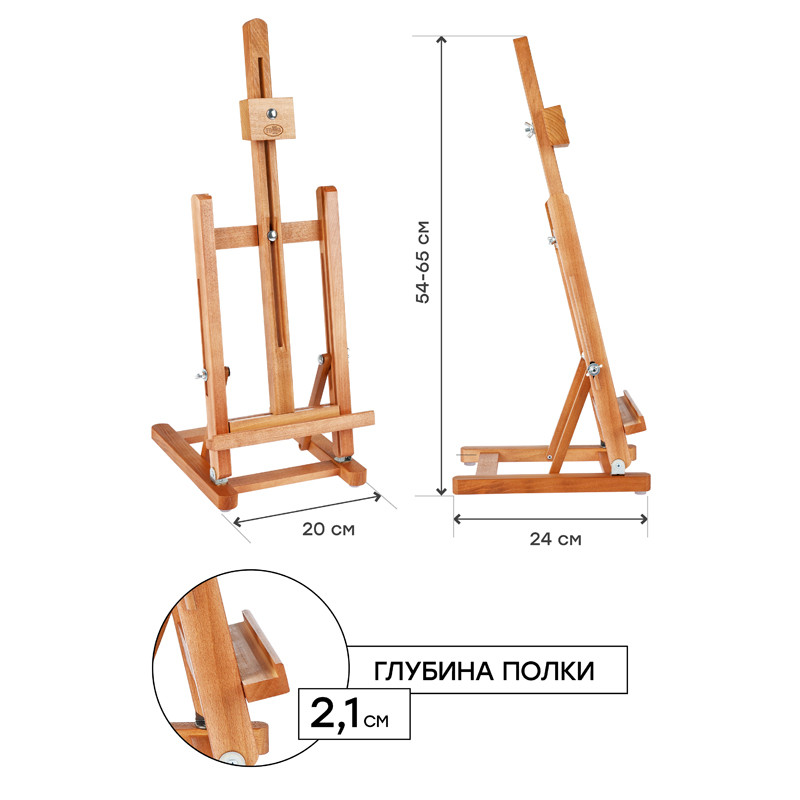 Настольный мольберт подходит для холстов небольшого размера. Размер мольберта – 20*24*54 (65) см, максимальный размер холста – 40 см.