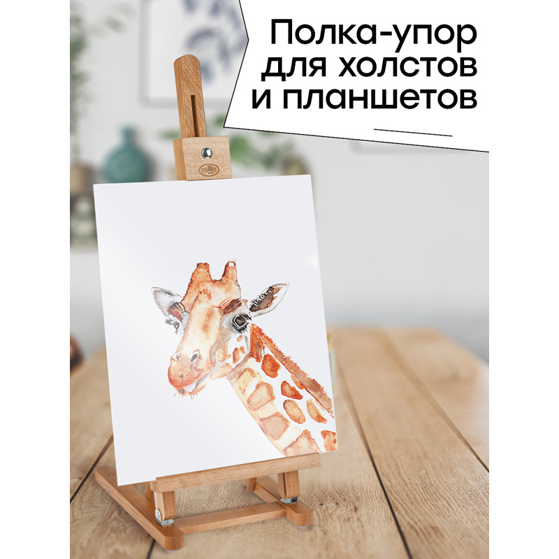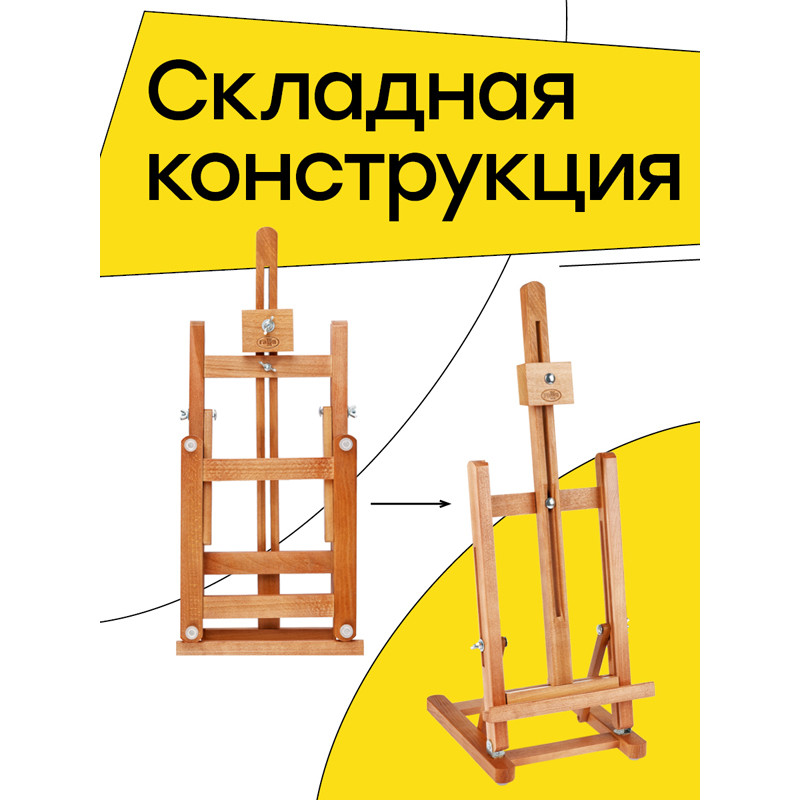 Верхний держатель мольберта надёжно фиксирует холст. Мольберт имеет плавную регулировку угла наклона и оснащён полкой-упором для холстов и планшетов. Он подходит начинающим и профессиональным художникам. Изготовлен из лакированного бука. Удобно хранить в сложенном виде.