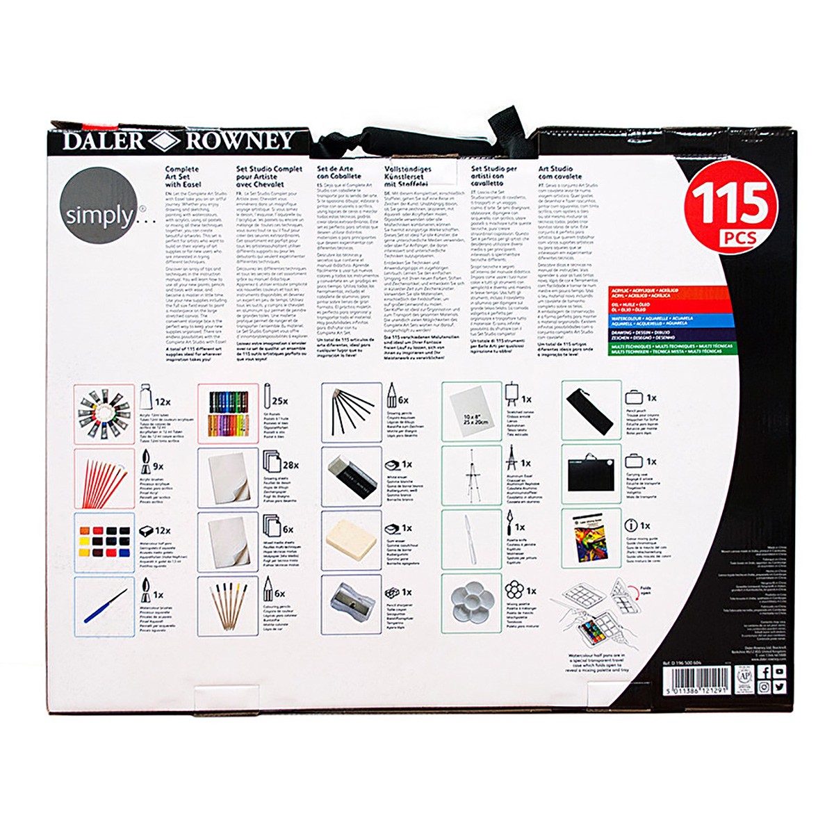 Набор "Art Easel Studio" (115 предметов) из линейки SIMPLY от Daler-Rowney станет отличным подарком. Его по достоинству оценят не только начинающие художники, но и состоявшиеся профессионалы. В нем есть всё, чтобы можно было начать творить сразу, открыв коробку. Состав набора позволяет создавать работы в разных графических и живописных техниках. Размеры коробки 58 х 46 х 8 см, вес - 2.6 кг.
