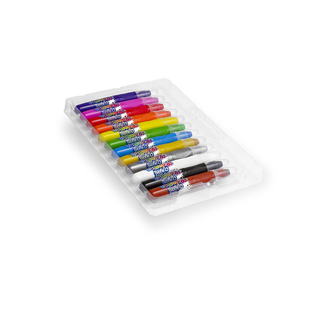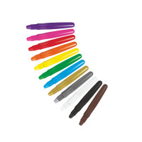В наборе 12 восковых мелков для детского творчества в пластиков корпусе. Корпус оснащен выкручивающим механизмом подачи мелка, благодаря которому руки ребенка остаются чистыми. Мелками можно рисовать, растушевывать и даже использовать кисть и воду для получения акварельных эффектов.