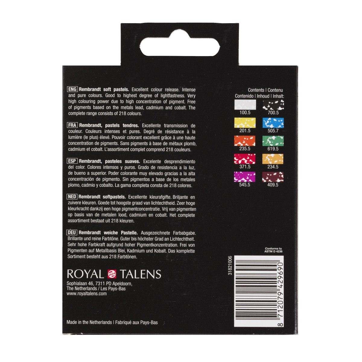Мягкая сухая пастель "Rembrandt" от Royal Talens - это всемирно известные художественные мелки для профессионального творчества. Они производятся в Нидерландах из чистейших пигментов и каолиновой глины высочайшего качества. Мелки пастели при работе не ломаются и не крошатся. Каждый цвет создан по уникальной формуле с учетом индивидуальных особенностей пигмента. Эти круглые пастельные мелки обладают превосходной мягкостью, что обеспечивает укрывистость и яркость всех цветов. Концентрация пигмента - максимальная (пигменты на основе тяжелых металлов не используются). Светостойкость - максимальная. Гарантия сохранности большинства цветов - более 100 лет в музейных условиях. В набор входят 10 мелков пастели половинного размера следующих цветов: 100,5 - 201,5 - 235,5 - 371,5 - 545,5 - 700,5 - 505,7 - 619,5 - 234,5 - 409,5 (см. ниже таблицу цветов).