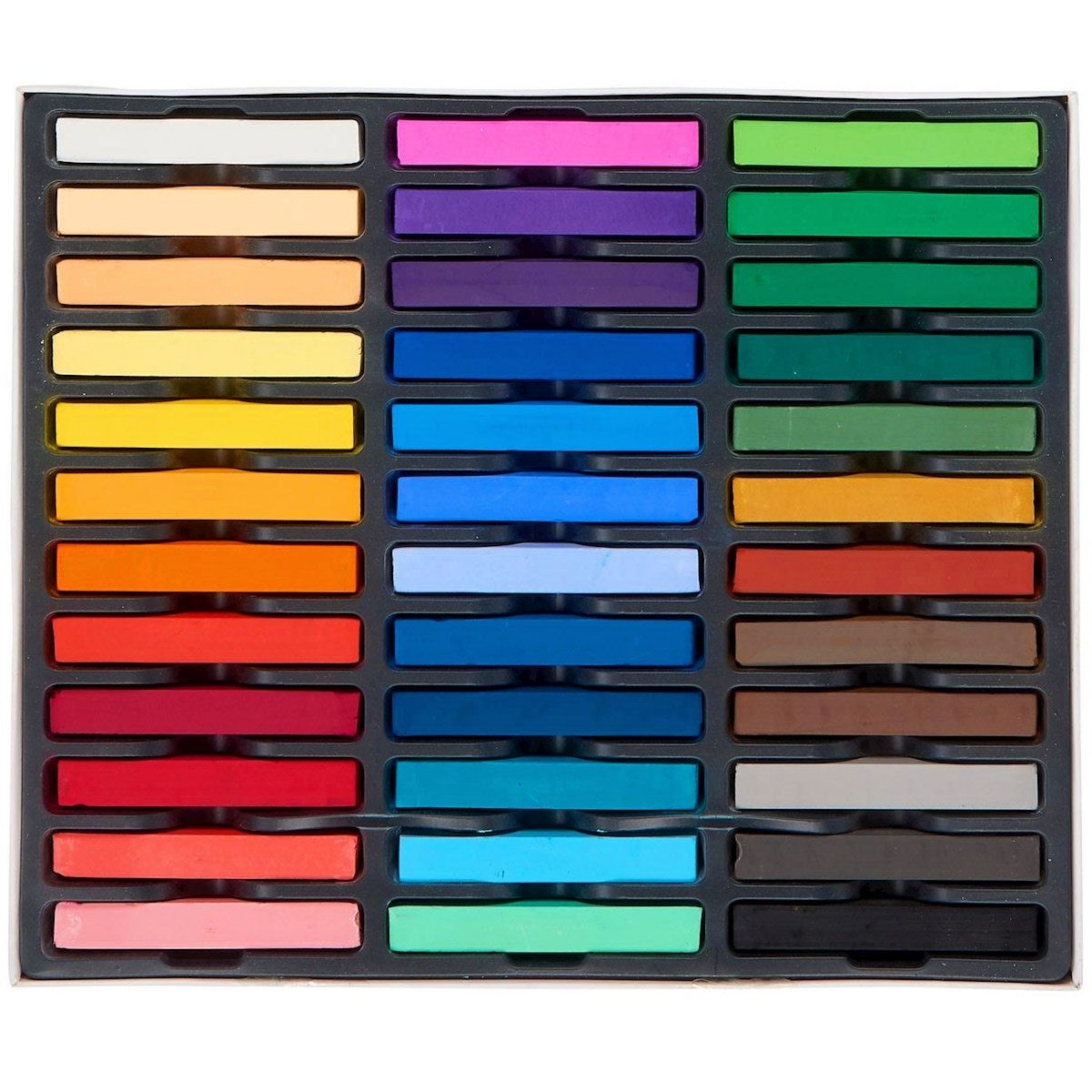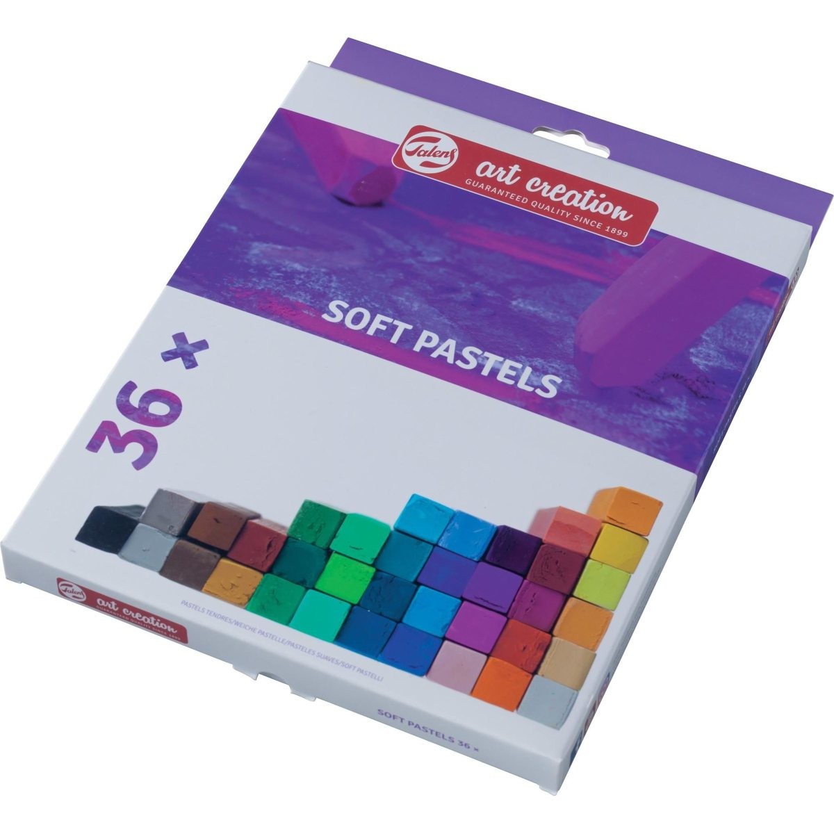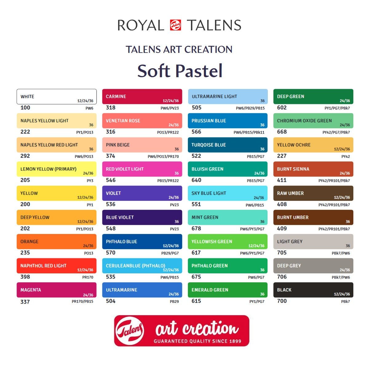 Сухая мягкая пастель "Art Creation" от Royal Talens изготавливается из высококачественных пигментов. Дает яркие бархатистые цвета. Пастель очень мягкая, не осыпается. Может быть использована на разных поверхностях, таких как: бумага, картон, камень, асфальт или дерево. (Картина, написанная сухой пастелью, не защищена от внешних воздействий без покрытия фиксативом!) Сухая пастель Art Creation прекрасно подойдет для начинающих художников, школьников и студентов. В набор входят 36 мелков пастели следующих цветов: 100-222-292-205-200-202-235-398-337-318-316-374-546-536-548-570-535-504-505-566-522- 640-551-678-617-675-615-602-668-227-411-408-409-705-706-700 (см. ниже таблицу цветов).