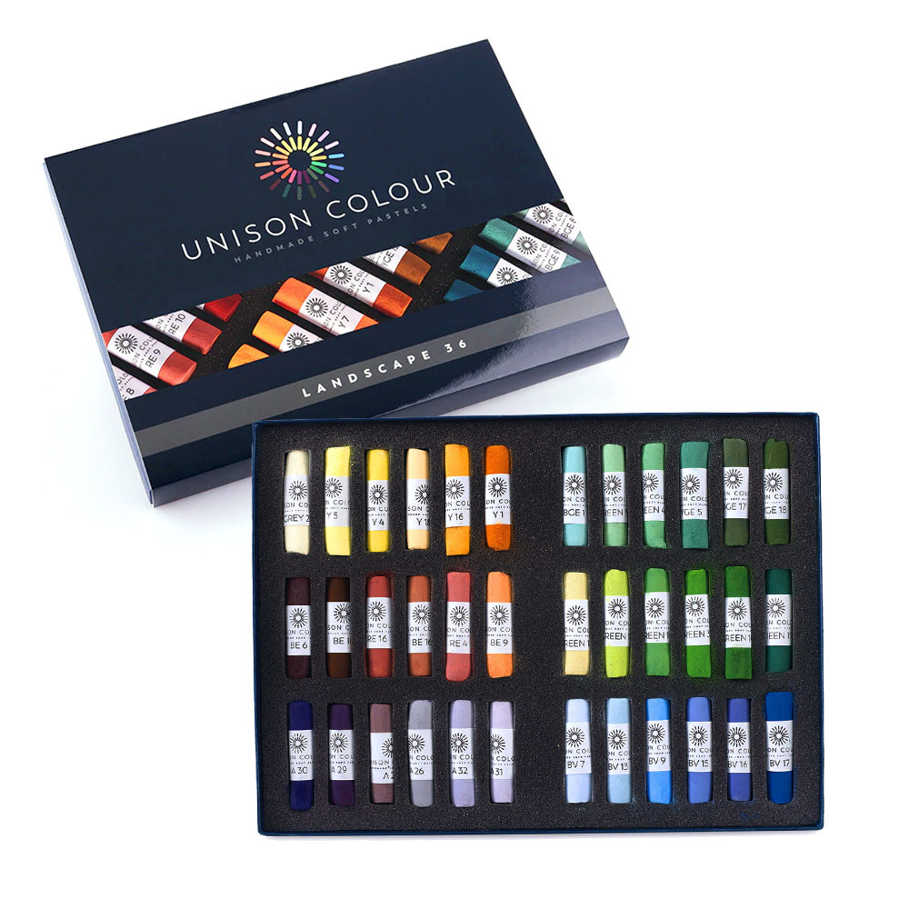 Cпециальный набор от Unison Colour (Великобритания) из 36 мелков пастели в бумажных манжетах, цвета которого тщательно подобраны для рисования пейзажей. Этот небольшой набор идеально подходит для тех, кто только начинает рисовать пастелью, или для тех, кому нужно добавлнение популярных оттенков к более полному набору. Мягкая пастель Unison проста в использовании, легко растушевывается, имеет гладкую маслянистую текстуру и растворяется в воде. Эти интенсивно пигментированные мелки обладают превосходной светостойкостью. Unison это - высококачественная художественная пастель, изготовленная вручную, с использованием традиционных пигментов.