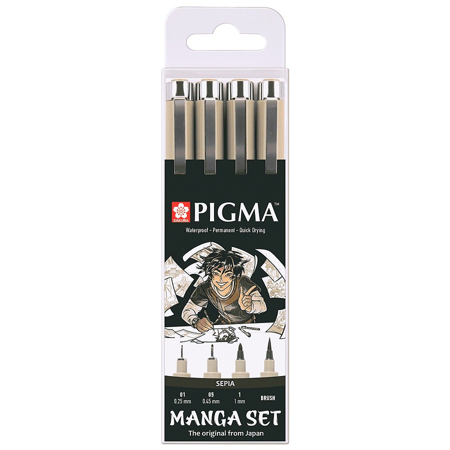 В набор "Manga Pigma Sepia" входят 4 капиллярные ручки цвета Сепия с различными пишущими узлами: Pigma Micron 01 (0.25мм); Pigma Micron 05 (0.45мм); Pigma Graphic 1 ("фломастерный" заостренный наконечник 1мм); Pigma Brush (наконечник - кисть).