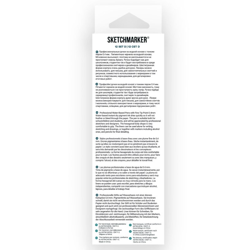 SKETCHMARKER ARTIST FINE PEN - профессиональные высококачественные капиллярные ручки с тонким наконечником 0.4 мм. Прекрасно подойдут для скетчинга, совместного использования с маркерами (в том числе и спиртовыми), карандашами, для деталировки готовых работ, летерринга, графики, декорирования. Эргономичная шестигранная форма корпуса не позволяет ручкам скатываться с рабочих поверхностей. Палитра состоит из 60 цветов: 8 флуоресцентных оттенков и 52 базовых (от светлых, пастельных оттенков до глубоких ярких тонов). Пигментные чернила на водной основе высыхают мгновенно, поэтому не расплываются и не проступают сквозь бумагу. Ручки длительное время не высыхают без колпачка. Чернила безвредны, сертифицированы и соответствуют стандартам безопасности и качества: европейским - EN71-3, американским - ASTM D-4236 (LHAMA Certification).