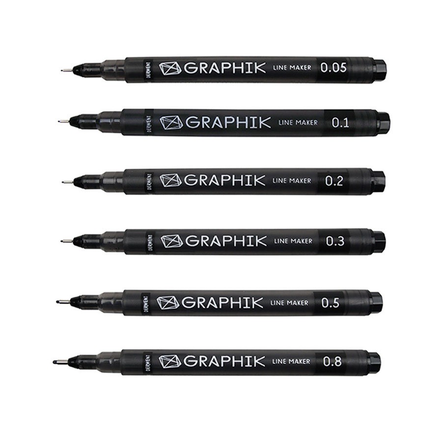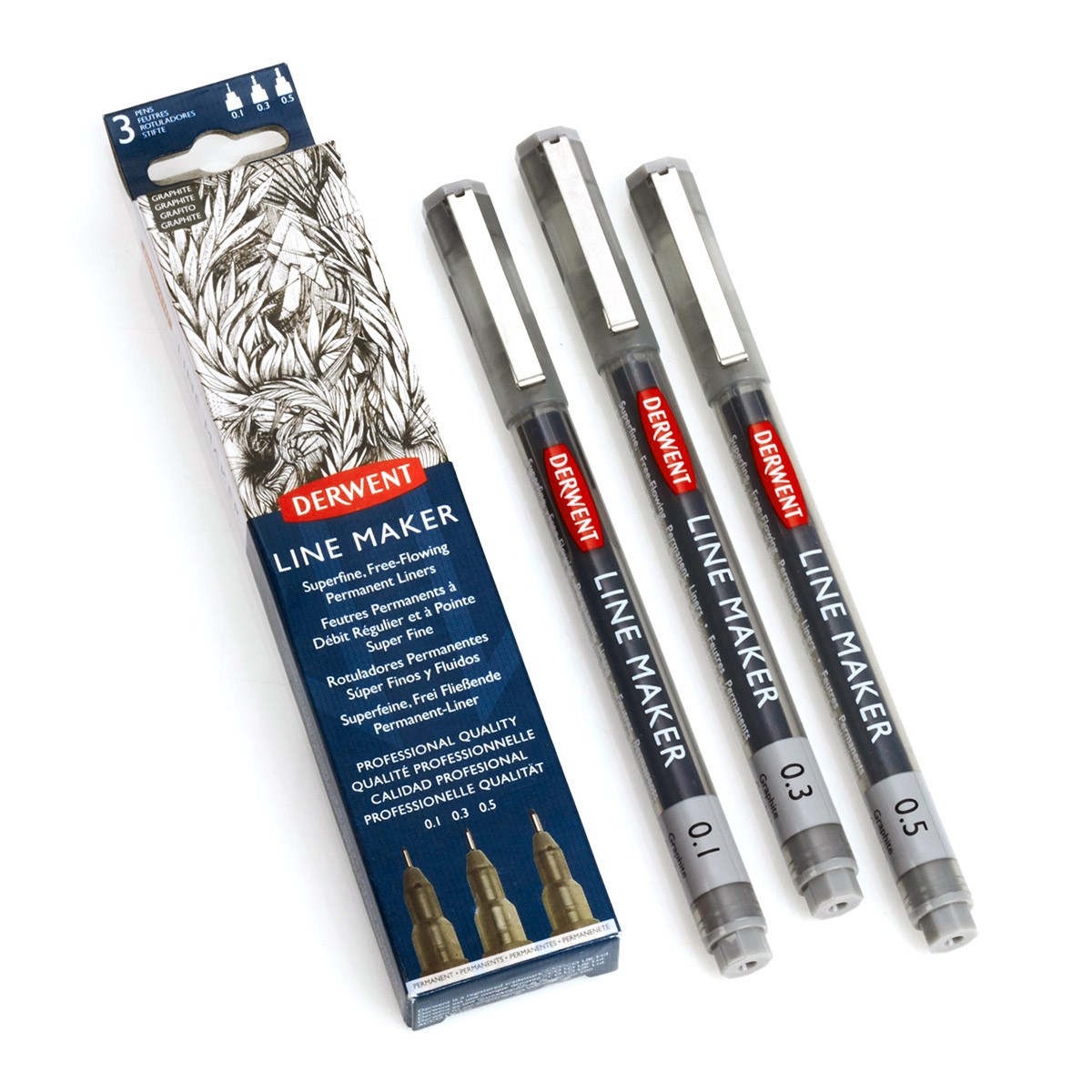 Линеры (капиллярные ручки) серии «Line Maker» от Derwent обладают прозрачным пластиковым корпусом и пишущим узлом высокого качества, который изготавливается в Японии. Заправлены высокопигментированными чернилами на водной основе, которые отличаются хорошей светостойкостью и быстро сохнут. Не содержат растворителей. В серии представлены линеры с вариациями толщины линии от 0.05 до 0.8 миллиметра. Они хорошо подойдут для создания скетчей и иллюстраций, рисования, черчения. В наборе - 3 линера Derwent Line Maker цвета "графит": 0.1мм, 0.3мм, 0.5мм.