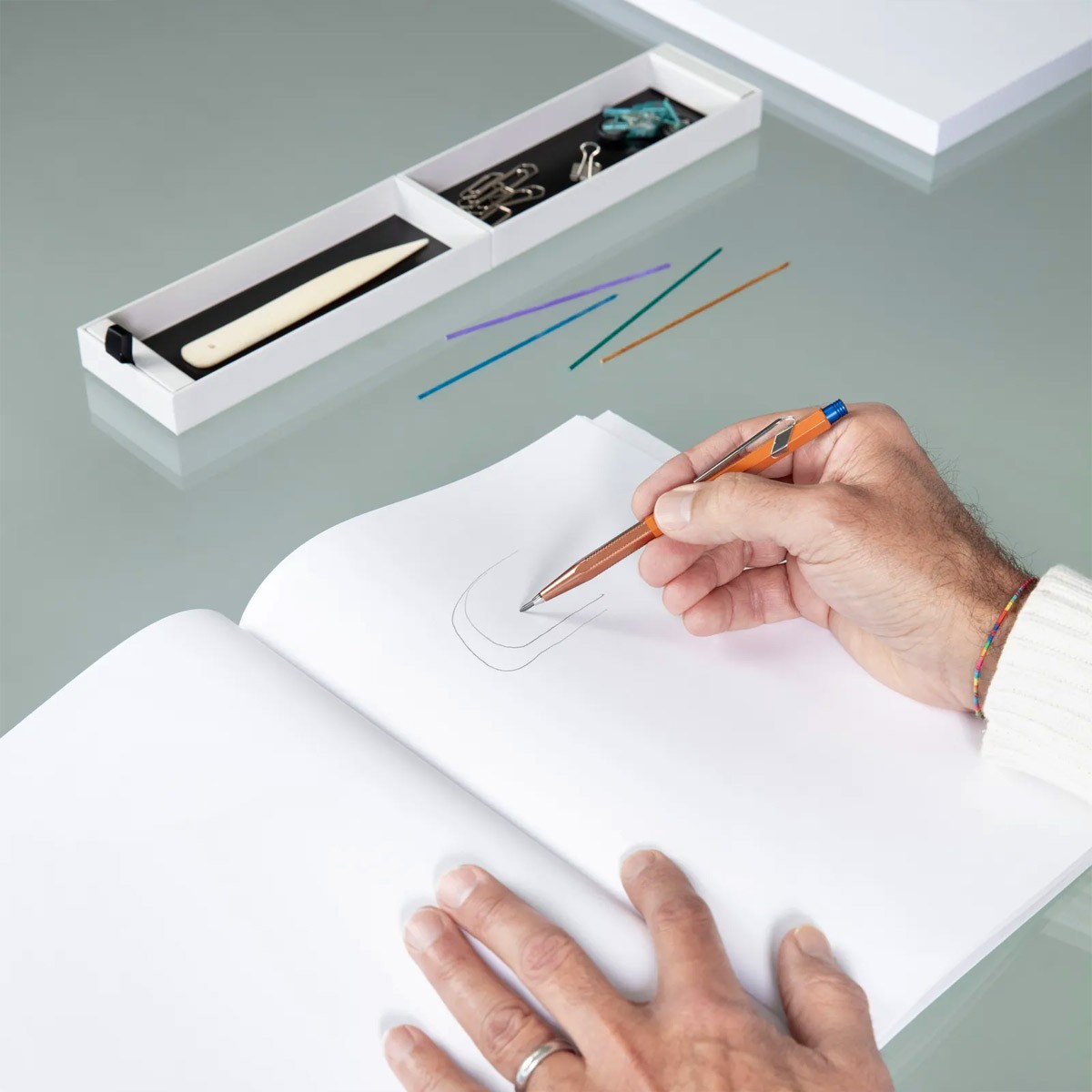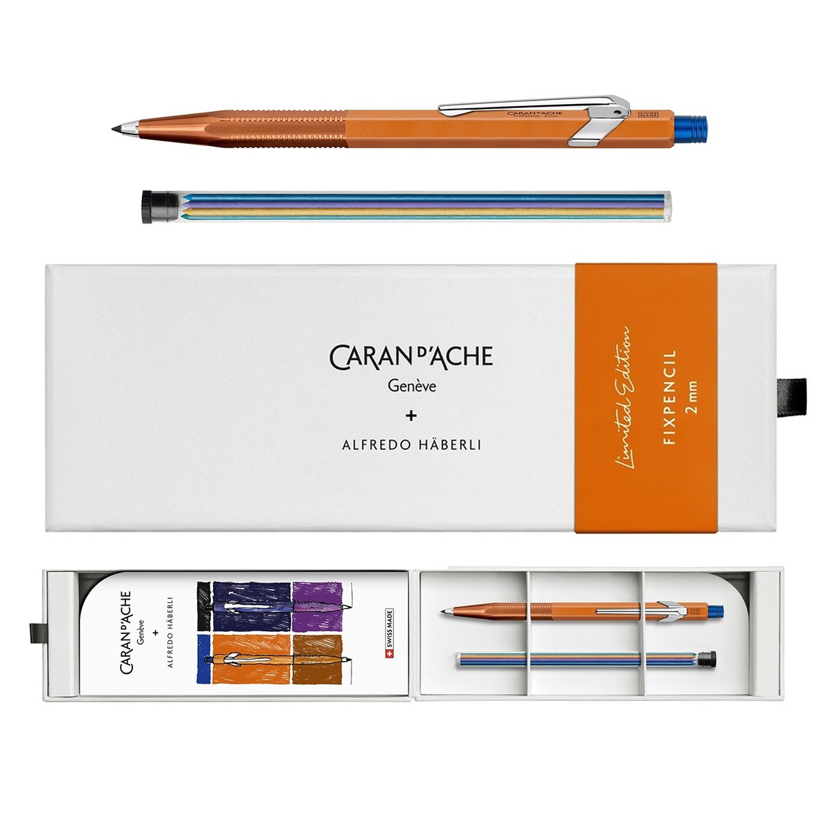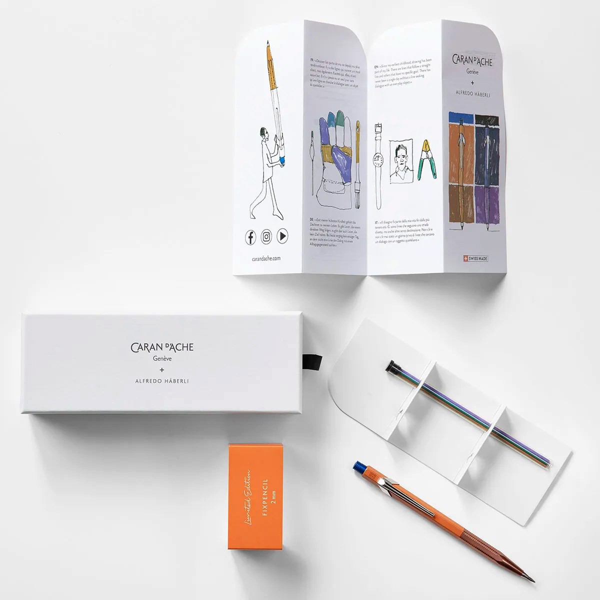 Caran d’Ache объединил усилия со всемирно известным дизайнером Альфредо Хэберли для создания ограниченного выпуска легендарного FIXPENCIL®. Этот механический карандаш, который Хэберли коллекционирует с детства, - всегдашний спутник его творений. В сочетании двух оттенков сливы или охры художник переосмысливает этот инструмент, который идеально подходит для предварительных набросков и спонтанной фиксации идей - незаменимый спутник архитекторов, инженеров, дизайнеров, иллюстраторов..! Помимо графитового стержня, дизайнерские нововведения включают в себя сочетание четырех водорастворимых цветных стержней для FIXPENCIL®, специально подобранных для рисунков декоративного и технического характера. Шестигранный корпус карандаша сделан из прочного и легкого алюминия и окрашен в два охристых оттенка - яркий и матовый. Корпус украшают блестящий серебристый зажим и синяя кнопка подачи грифеля, которая является точилкой. Карандаш поставляется с 1 графитовым стержнем 2мм (твердость B) и 4 цветными водорастворимыми грифелями 2мм (кобальт синий, изумрудно-зеленый, охра, барвинок синий). Набор упакован в стильную подарочную коробку (размеры: 181x66x44мм).