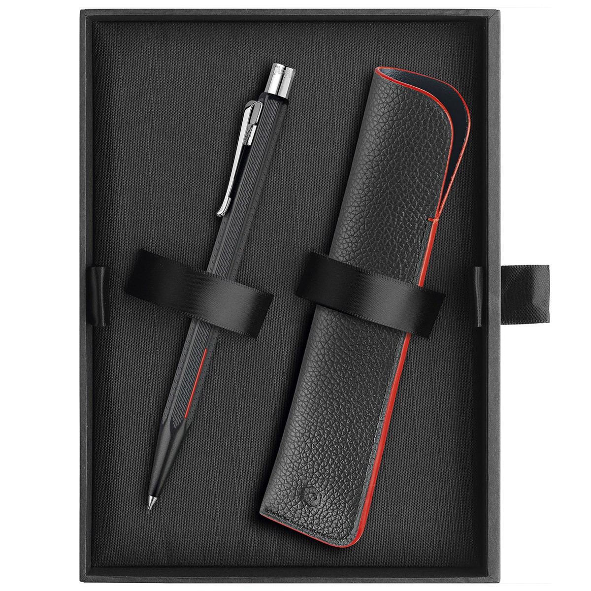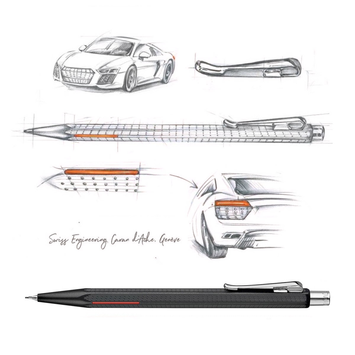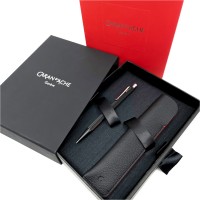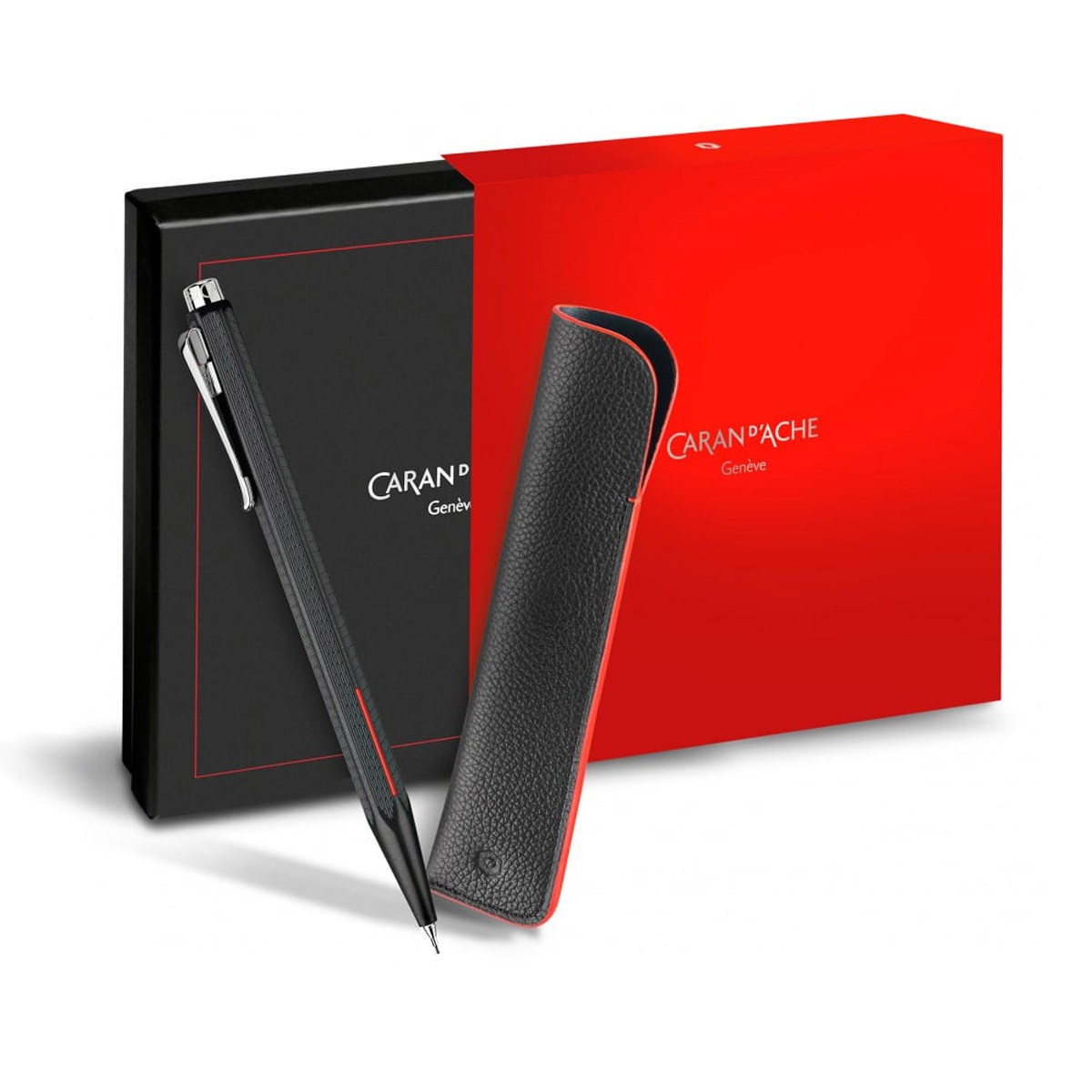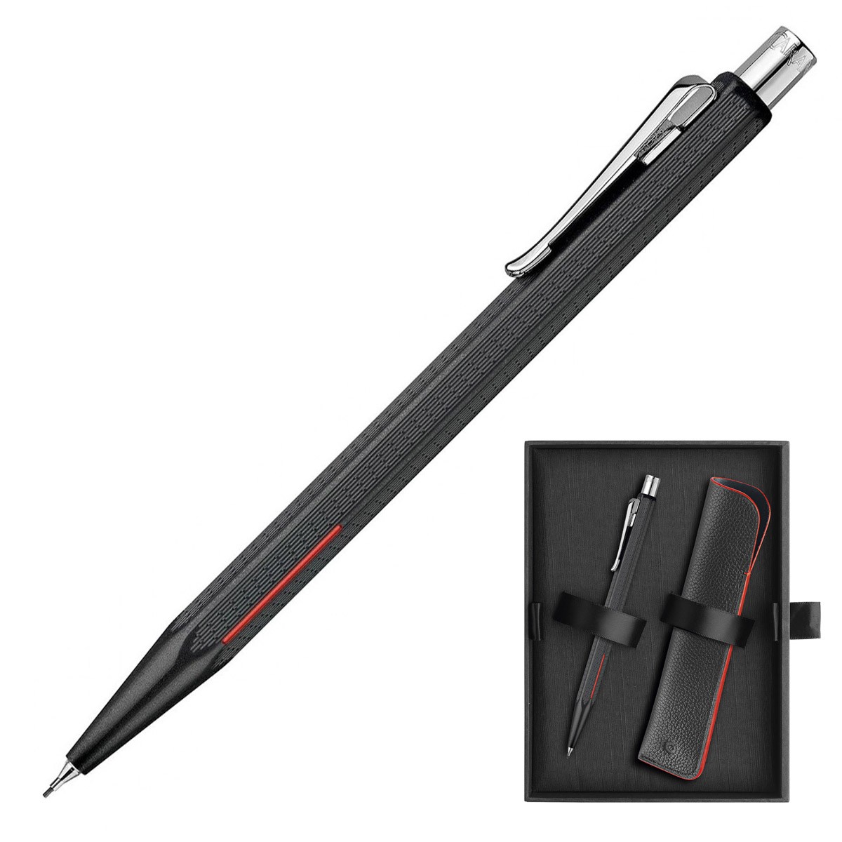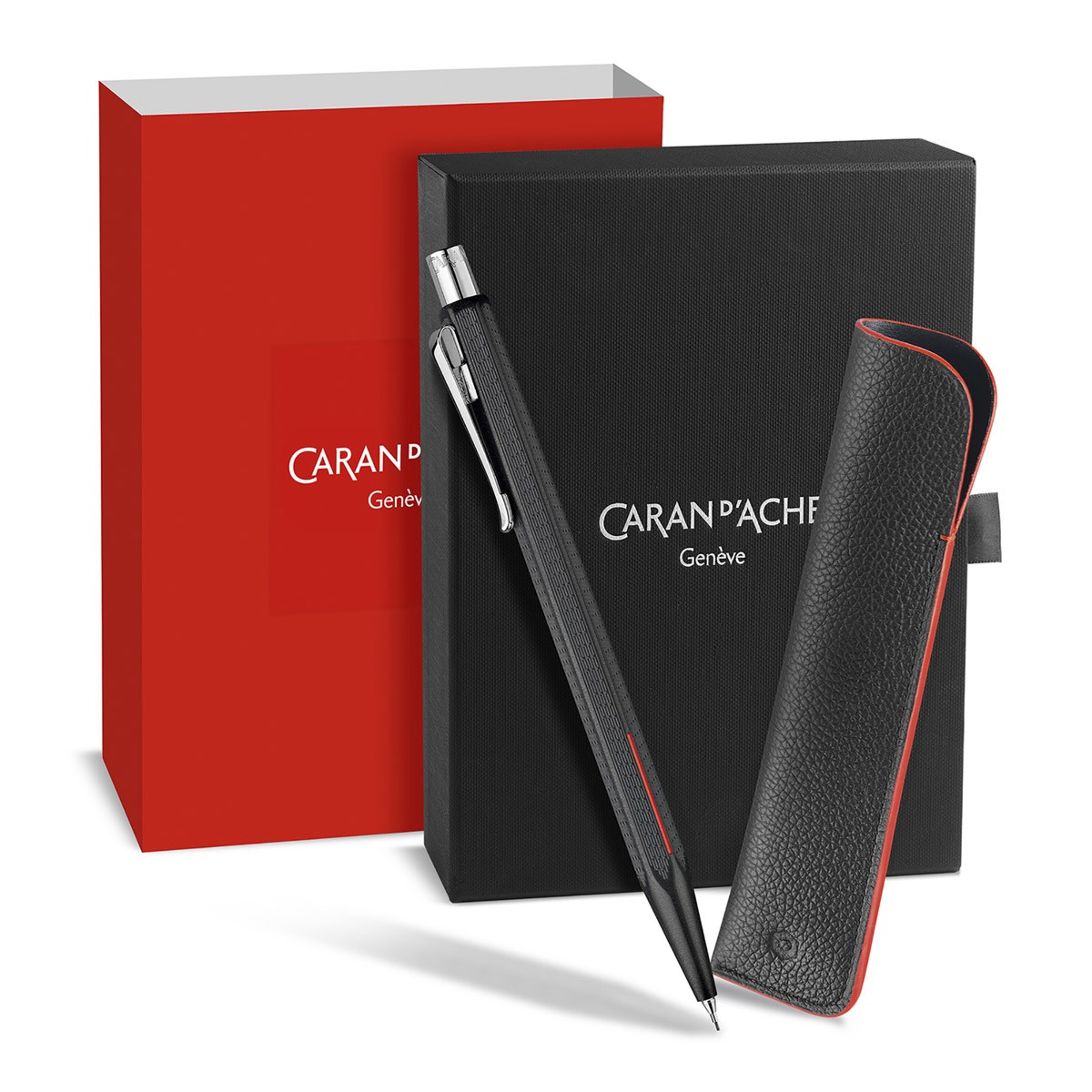 Коллекция Caran d’Ache Ecridor Racing в своём дизайне тонко переосмысливает коды автомобильной иконографии. Шестигранный корпус механического карандаша Ecridor Racing выполнен из латуни, сверху нанесено черное хромовое покрытие с песочной отделкой для матового эффекта. Гильоширование машинной резки, сделанное на корпусе, напоминает решетки радиатора гоночных автомобилей. Красный лак, нанесенный вручную по двум ребрам, напоминает свечение стоп-сигналов. Упругий зажим и кнопка подачи грифеля (с логотипом Caran d’Ache, выгравированным лазером) имеют палладиевое покрытие. Под колпачком кнопки скрываются ластик и контейнер с запасными грифелями 0,7 мм. Длина карандаша - 131мм, диаметр - 8 мм. Этот пишущий инструмент, в современном, но утонченном стиле, станет идеальным компаньоном для мужчин с характером. Карандаш поставляется в комплекте с кожаным футляром, выполненном в том же стиле - черная матовая поверхность, тонкая красная окантовка. Оба предмета упакованы в черную подарочную коробку, защищенную красной "обложкой".
