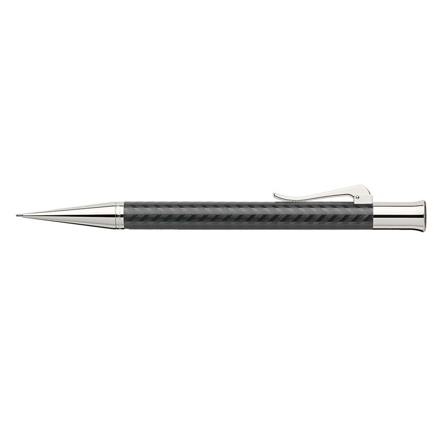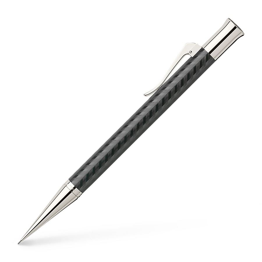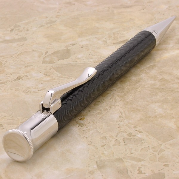 Карандаш механический "Guilloche Chevron Black" немецкой марки "Graf von Faber-Castell" выполнен из черной драгоценной смолы, декорированной "шевронами" (от фр. "chevron" - "V-образные знаки") в технике "гильош" ("guilloche"), используемой ювелирами при обработке драгоценных металлов. Для создания этого карандаша его корпус вручную многократно покрывался смолистым лаком, с последующей сушкой и полировкой каждого слоя. После чего вручную наносилась гравировка. В результате любой из пишущих инструментов серии "Guilloche" является штучной работой, хранящей тепло человеческих рук, - уникальной структурой с индивидуальным орнаментом. Помимо тонкой гравировки карандаш украшают покрытые родием передние и торцевые элементы, и тонкая гравированная печать "Handmade in Germany" ("Сделано вручную в Германии"). Механический карандаш оснащен прочным грифелем толщиной 0,7 мм, отсеком для хранения сменных грифелей, а также сменным ластиком белого цвета под торцевым колпачком. Тугой зажим на колпачке имеет пружинную систему.