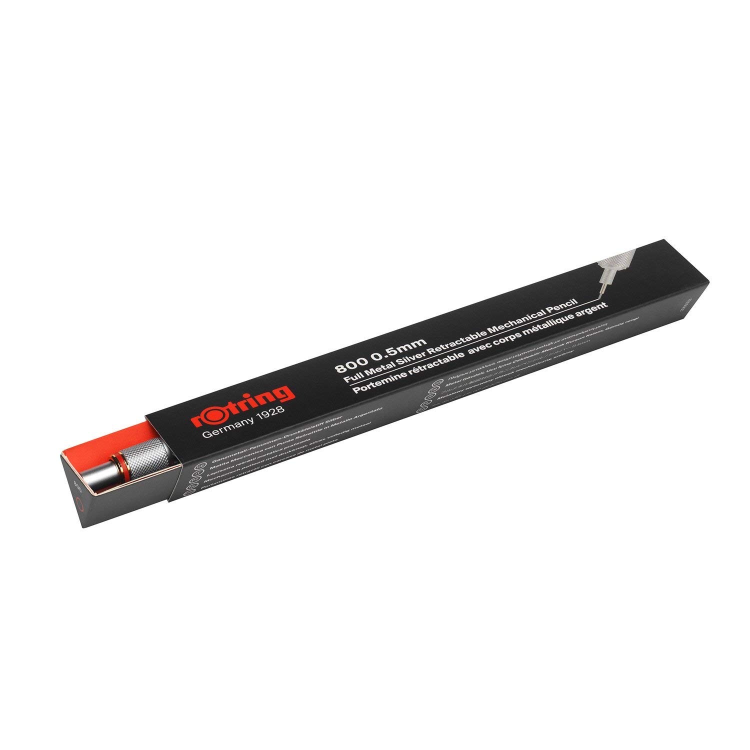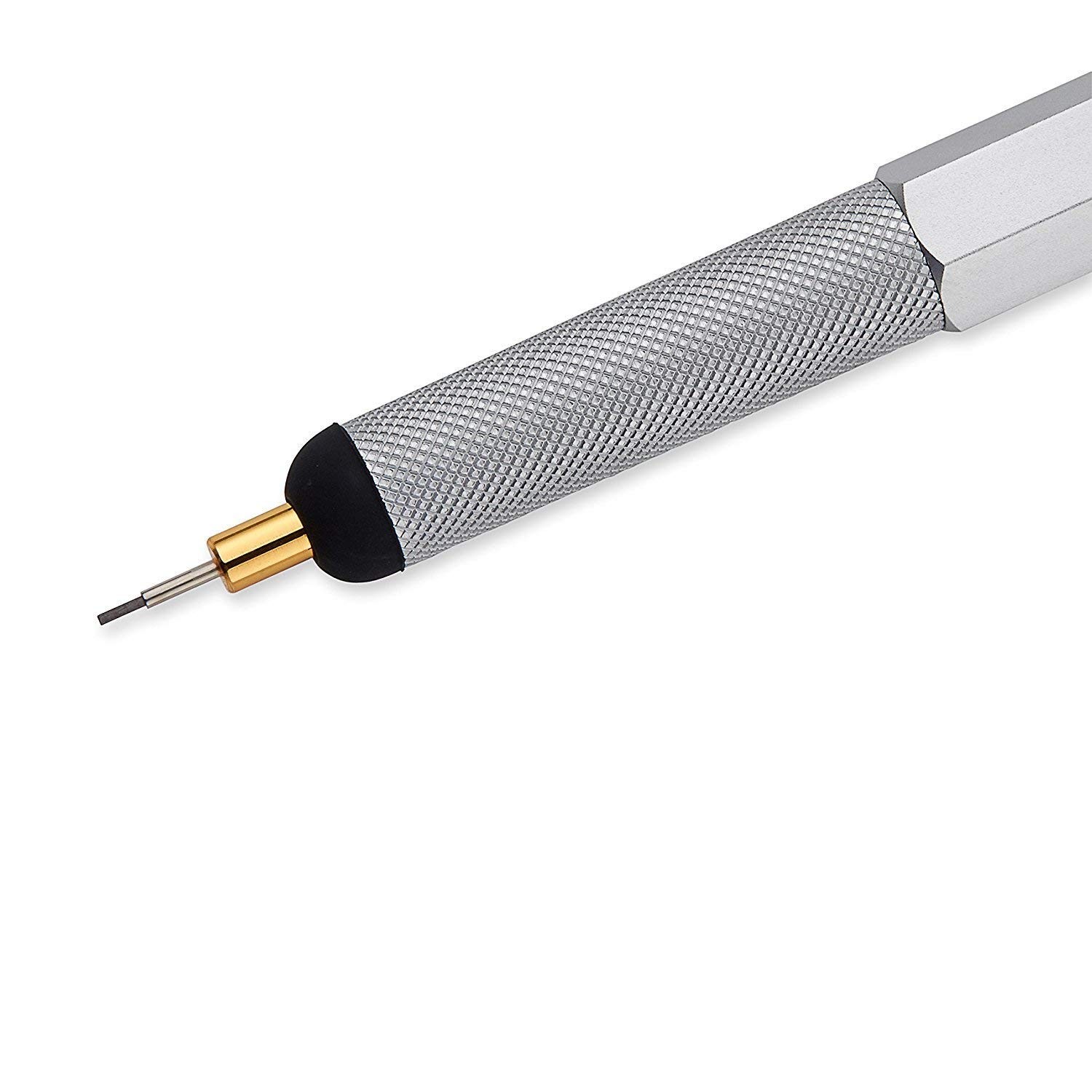 Механизм карандаша подает грифель очень точно. Под металлическим колпачком спрятан белоснежный твердый ластик. Наконечник (тонкая блестящая трубочка, из которой выдвигается грифель) убирается внутрь корпуса, что увеличивает срок службы (с одной стороны, карандаш сложнее повредить при транспортировке, с другой - наконечник не будет пытаться проколоть пенал или футляр при переноске). Пишущий узел выдвигается, если покрутить колечко, которое расположено на корпусе около клипа (на этом месте у младших моделей Rotring располагается поворотный указатель твердости).