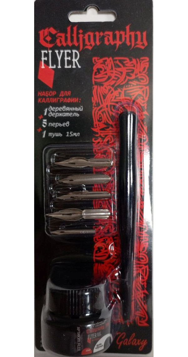 Набор для каллиграфии от бренда Flyer отлично подойдет для начинающих каллиграфистов и любителей художественного письма. Набор содержит деревянный держатель для перьев, 4 пера для каллиграфии с разной толщиной линии письма и черная тушь.