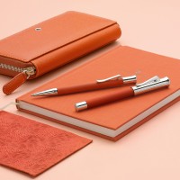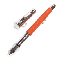 Перьевая ручка оранжевого цвета "Guilloche Burned Orange" немецкой марки "Graf von Faber-Castell" выполнена из драгоценной смолы, декорированной в технике "гильош" ("guilloche"), используемой ювелирами при обработке драгоценных металлов. Для создания этой ручки её корпус вручную многократно покрывался смолистым лаком, с последующей сушкой и полировкой каждого слоя. После чего вручную наносилась гравировка. В результате любая из ручек серии "Guilloche" является штучной работой, хранящей тепло человеческих рук, - уникальной структурой с индивидуальным орнаментом. Помимо тонкой гравировки ручку украшают покрытые родием передние и торцевые элементы, и тонкая гравированная печать "Handmade in Germany" ("Сделано вручную в Германии"). Для заправки предусмотрена возможность использования картриджей или конвертерной системы. Перо сделано из золота (18 карат) с родиевым покрытием. Колпачок - завинчивающийся. Тугой зажим на колпачке имеет пружинную систему.