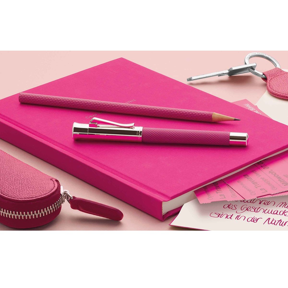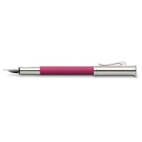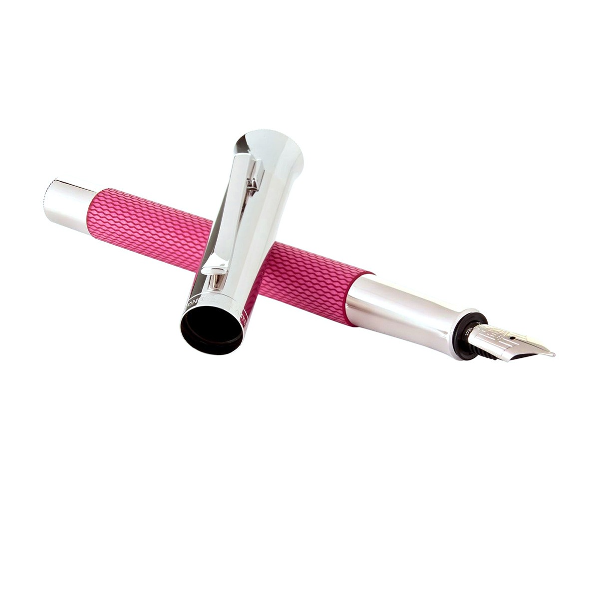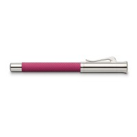 Перьевая ручка ярко-розового цвета "Guilloche Electric Pink" немецкой марки "Graf von Faber-Castell" выполнена из драгоценной смолы, декорированной в технике "гильош" ("guilloche"), используемой ювелирами при обработке драгоценных металлов. Для создания этой ручки её корпус вручную многократно покрывался смолистым лаком, с последующей сушкой и полировкой каждого слоя. После чего вручную наносилась гравировка. В результате любая из ручек серии "Guilloche" является штучной работой, хранящей тепло человеческих рук, - уникальной структурой с индивидуальным орнаментом. Помимо тонкой гравировки ручку украшают покрытые родием передние и торцевые элементы, и тонкая гравированная печать "Handmade in Germany" ("Сделано вручную в Германии"). Для заправки предусмотрена возможность использования картриджей или конвертерной системы. Перо сделано из золота (18 карат) с родиевым покрытием. Колпачок - завинчивающийся. Тугой зажим на колпачке имеет пружинную систему.