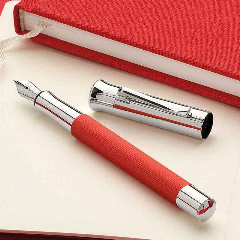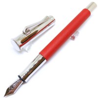 Перьевая ручка красного цвета "Guilloche India Red" немецкой марки "Graf von Faber-Castell" выполнена из драгоценной смолы, декорированной в технике "гильош" ("guilloche"), используемой ювелирами при обработке драгоценных металлов. Для создания этой ручки её корпус вручную многократно покрывался смолистым лаком, с последующей сушкой и полировкой каждого слоя. После чего вручную наносилась гравировка. В результате любая из ручек серии "Guilloche" является штучной работой, хранящей тепло человеческих рук, - уникальной структурой с индивидуальным орнаментом. Помимо тонкой гравировки ручку украшают покрытые родием передние и торцевые элементы, и тонкая гравированная печать "Handmade in Germany" ("Сделано вручную в Германии"). Для заправки предусмотрена возможность использования картриджей или конвертерной системы. Перо сделано из золота (18 карат) с родиевым покрытием. Колпачок - завинчивающийся. Тугой зажим на колпачке имеет пружинную систему.