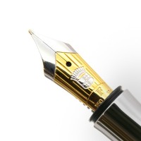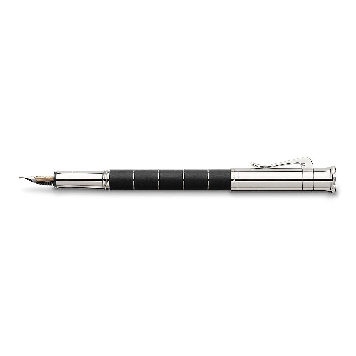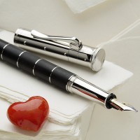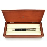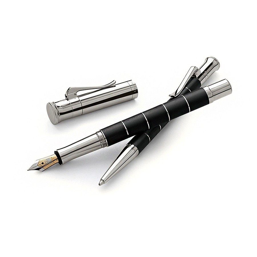 Перьевая ручка "Classic Anello Ebony" немецкой марки "Graf von Faber-Castell" объединяет в себе естественное и теплое обаяние древесины с элегантностью прохладного платинового блеска деталей и декоративных колец ("Anello" - итал. "Кольцо"). Корпус сделан из разделенных кольцами сегментов драгоценной эбеновой древесины, добываемой в тропических лесах Африки и Азии. Эта древесина - чрезвычайно плотная и тонет в воде. Из нее делают дорогую мебель, детали музыкальных инструментов и высококлассные декоративные вещи. Помимо колец ручку украшают покрытые платиной передние и торцевые элементы и тонкая гравированная печать "Handmade in Germany" ("Сделано вручную в Германии"). Для заправки предусмотрена возможность использования картриджей или конвертерной системы. Перо сделано из двухцветного золота (18 карат) с кончиком из твердого сплава. Колпачок - завинчивающийся. Тугой зажим на колпачке имеет пружинную систему.