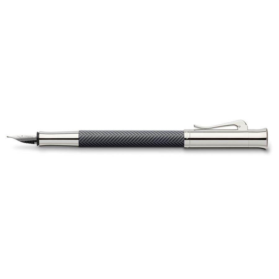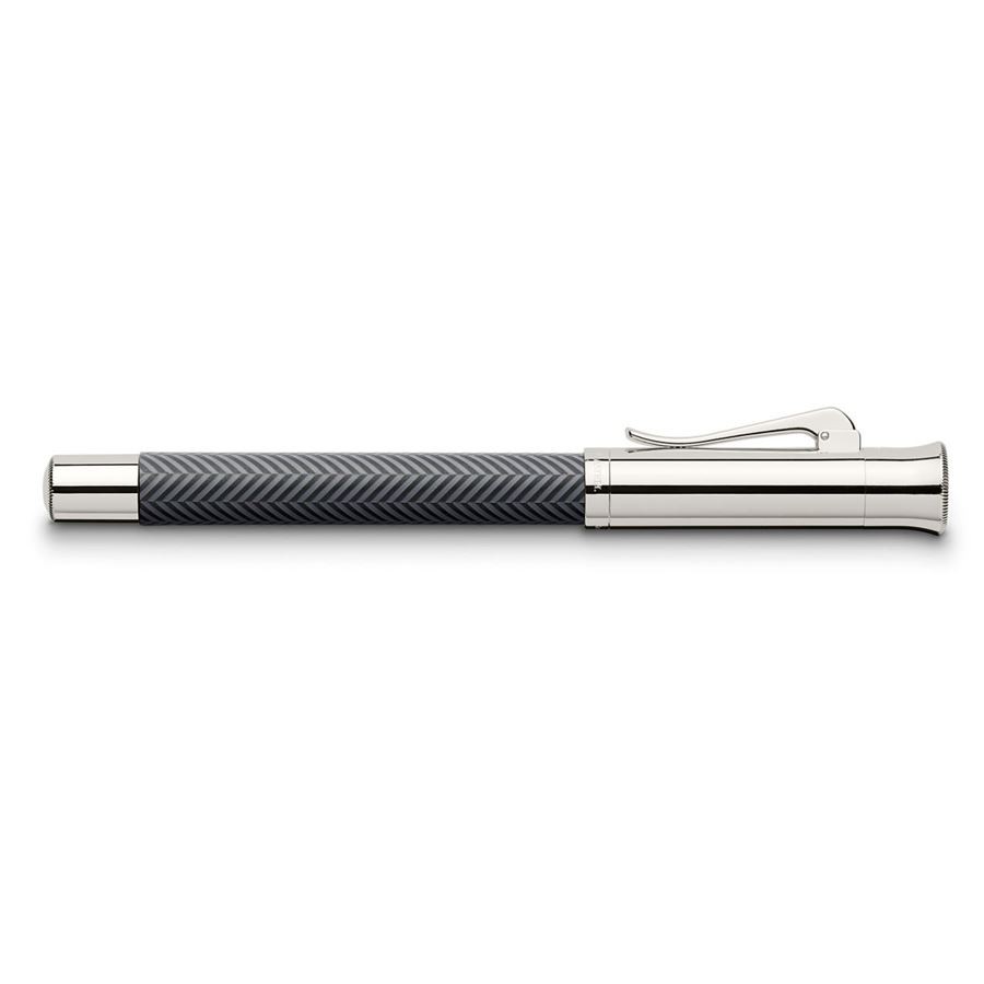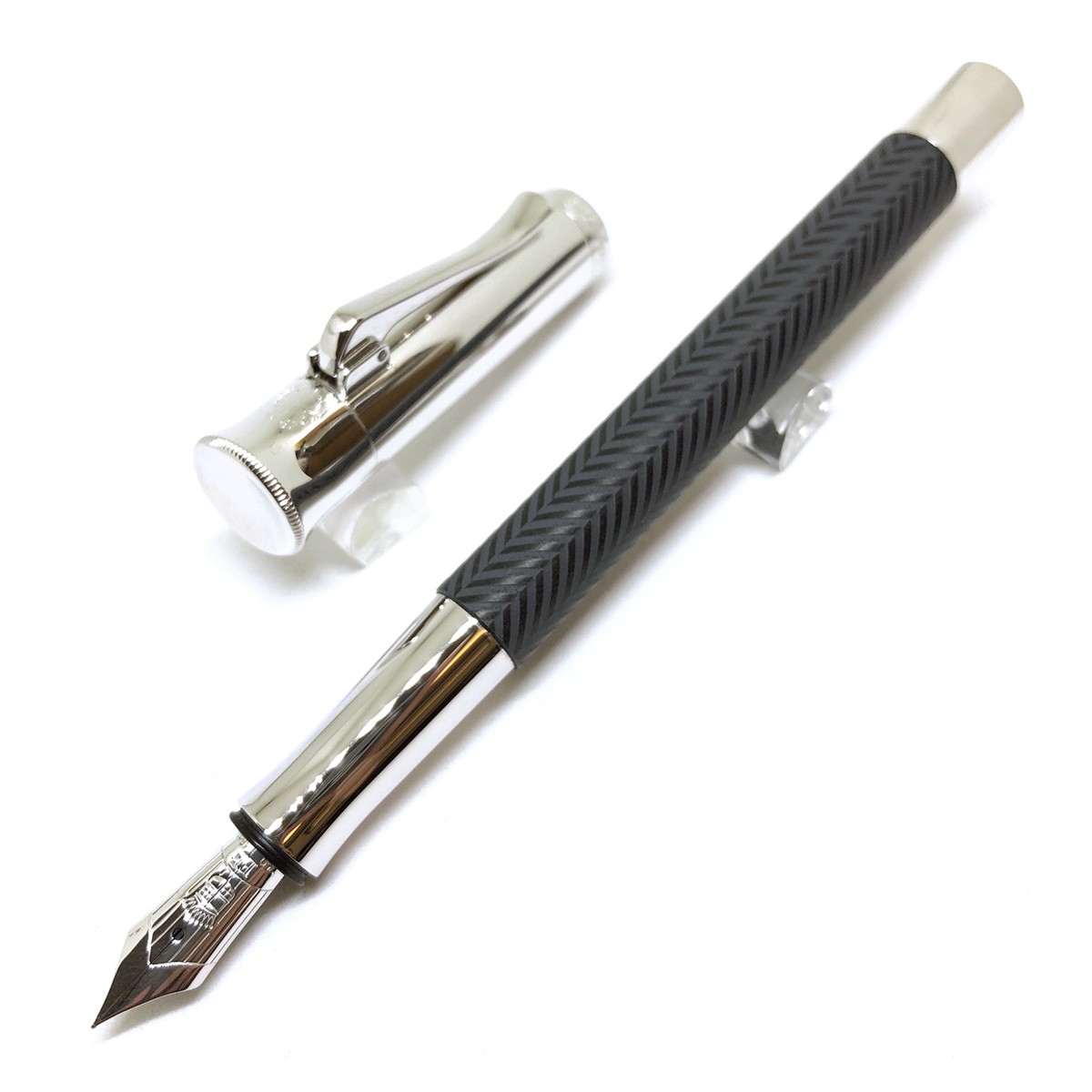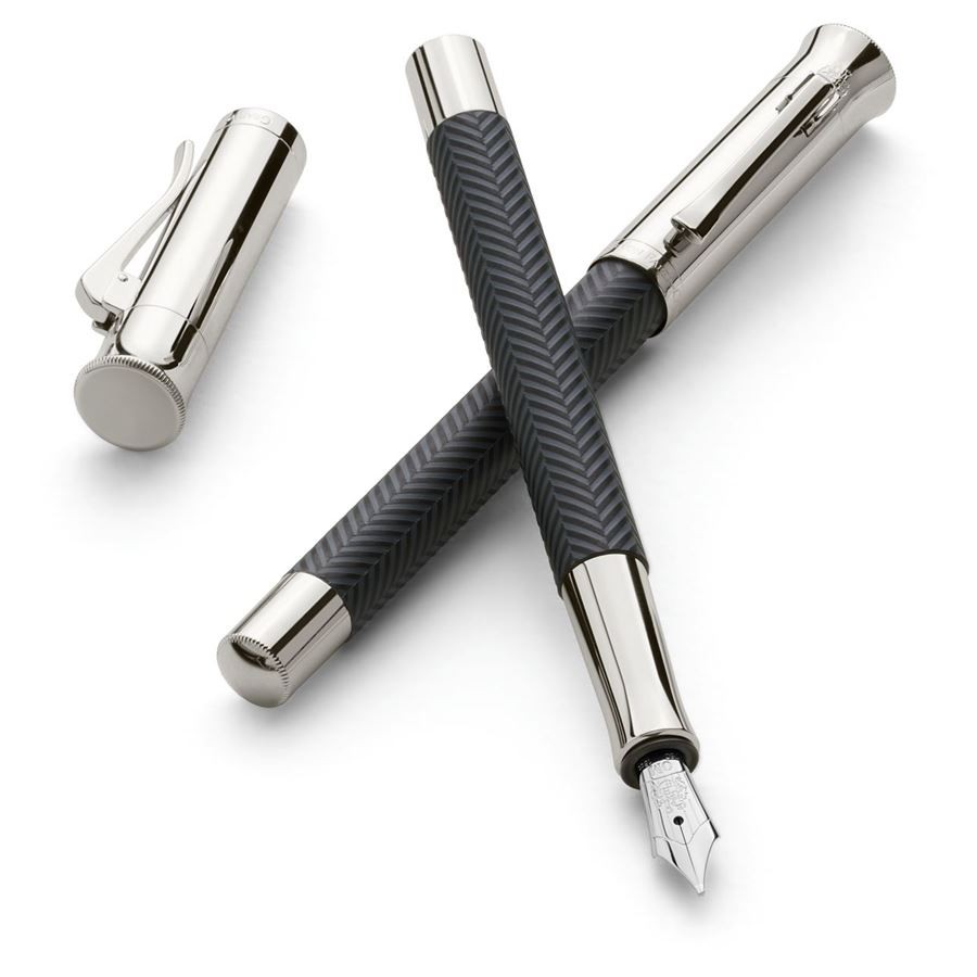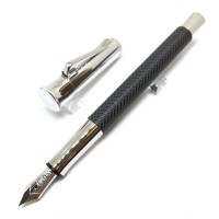 Перьевая ручка антрацитового цвета "Guilloche Cisele Anthracite" немецкой марки "Graf von Faber-Castell" выполнена из драгоценной смолы, декорированной рисунком-"ёлочкой" в технике "гильош" ("guilloche"), используемой ювелирами при обработке драгоценных металлов. Для создания этой ручки её корпус вручную многократно покрывался смолистым лаком, с последующей сушкой и полировкой каждого слоя. После чего вручную наносилась гравировка. В результате любая из ручек серии "Guilloche" является штучной работой, хранящей тепло человеческих рук, - уникальной структурой с индивидуальным орнаментом. Помимо тонкой гравировки ручку украшают покрытые родием передние и торцевые элементы, и тонкая гравированная печать "Handmade in Germany" ("Сделано вручную в Германии"). Для заправки предусмотрена возможность использования картриджей или конвертерной системы. Перо сделано из золота (18 карат) с родиевым покрытием. Колпачок - завинчивающийся. Тугой зажим на колпачке имеет пружинную систему.