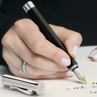 Перьевая ручка "Intuition Platino Ebony" немецкой марки "Graf von Faber-Castell" объединяет в себе естественное и теплое обаяние древесины с прохладной элегантной платиновой поверхностью декоративных деталей. Облик этих ручек приближен к природе и предельно минималистичен: ни одно соединение не прерывает точные и чистые линии дизайна. Небольшое углубление на корпусе в области захвата не только говорит о кропотливости работы, проделанной мастерами, но и обеспечивает максимальный комфорт во время письма. Корпус сделан из драгоценной эбеновой древесины, добываемой в тропических лесах Африки и Азии. Эта древесина - чрезвычайно плотная и тонет в воде. Из нее делают дорогую мебель, детали музыкальных инструментов и высококлассные декоративные вещи. На деревянную поверхность ручки нанесены продольные бороздки. Кроме того ручку украшают покрытые платиной передние и торцевые элементы и тонкие гравировки. Для заправки предусмотрена возможность использования картриджей или конвертерной системы. Перо увеличенного размера сделано из двухцветного золота (18 карат) с кончиком из твердого сплава. Колпачок - завинчивающийся. Тугой зажим на колпачке имеет пружинную систему.