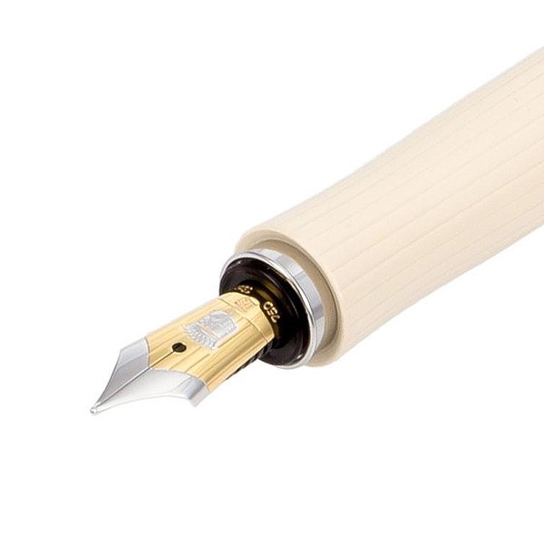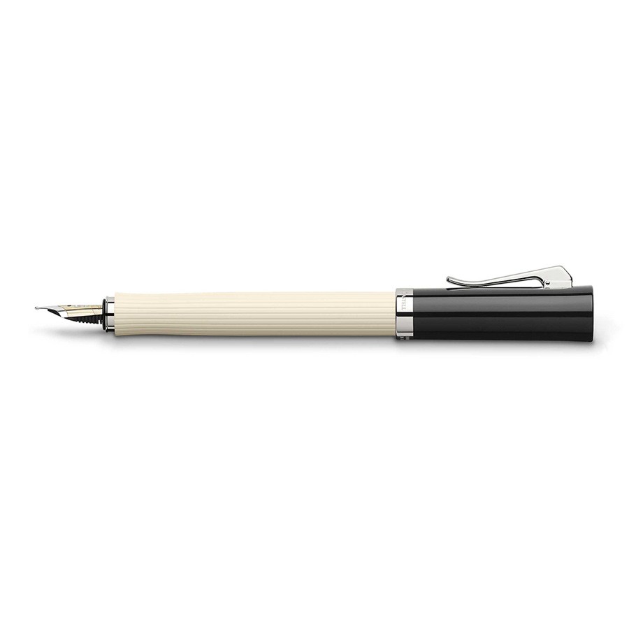 Перьевая ручка "Intuition Platino Fluted Ivory" немецкой марки "Graf von Faber-Castell" объединяет в себе теплый матовый блеск ребристого корпуса, гладкую полировку колпачка из черной смолы и прохладную элегантность платиновой поверхности декоративных деталей. Небольшое углубление на корпусе в области захвата не только говорит о кропотливости работы, проделанной мастерами, но и обеспечивает максимальный комфорт во время письма. Корпус сделан из драгоценной смолы цвета слоновой кости, многократно нанесенной вручную слой за слоем. На поверхность корпуса нанесены продольные бороздки. Кроме того ручку украшают покрытые платиной передние и торцевые элементы и тонкие гравировки. Для заправки предусмотрена возможность использования картриджей или конвертерной системы. Перо сделано из двухцветного золота (18 карат) с кончиком из твердого сплава. Колпачок - завинчивающийся. Тугой зажим на колпачке имеет пружинную систему.