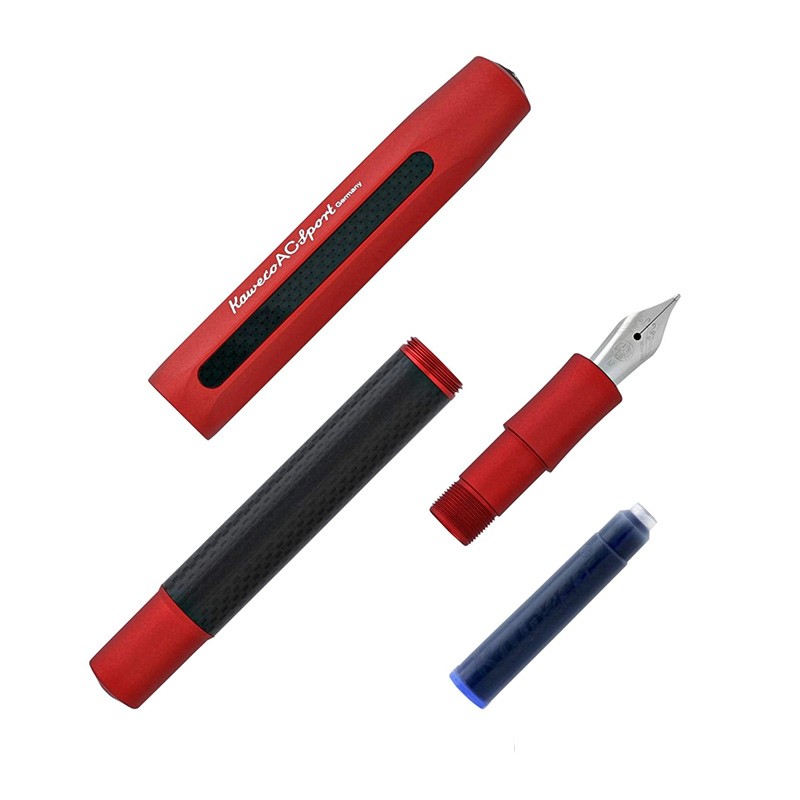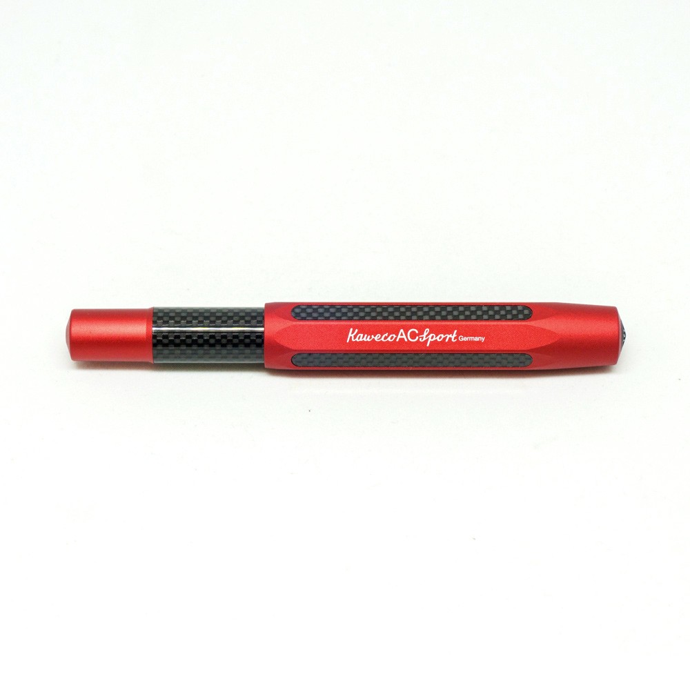 Ручки "AC Sport" от немецкой компании Kaweco изготовлены из литого алюминия и карбона. Их облик сочетает в себе традиции Kaweco начала 20-го века, выраженные оригинальной восьмигранной формой корпуса, и технологичный дизайн современных гоночных автомобилей. Гравированное перо из нержавеющей стали снабжено иридиевым наконечником. На корпусе сделана гравировка серебряного цвета. Колпачок на резьбе, надёжно защищающий ручку, украшен на торце металлическим логотипом. В закрытом виде длина ручки составляет всего 10.5см, она легко помещается в небольшую сумку, барсетку или карман. Ручка выглядит компактно, но основательно и солидно, не создавая ощущение миниатюрности. В открытом состоянии ручка имеет длину - 13.5см, обеспечивая отличный баланс. Диаметр ручки в самом широком месте - 1.4см. Ручка идёт в комплекте с одним синим картриджем (International Short). Также в ручках серии "Sport" можно использовать мини-конвертер Kaweco. К ручке можно отдельно приобрести клип. ВАЖНО: от долгого контакта с чернилами металлические элементы ручки могут начать ржаветь. Не погружайте ручку в чернила и после работы удостоверьтесь, что на ручке не осталось чернил.