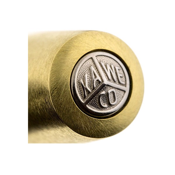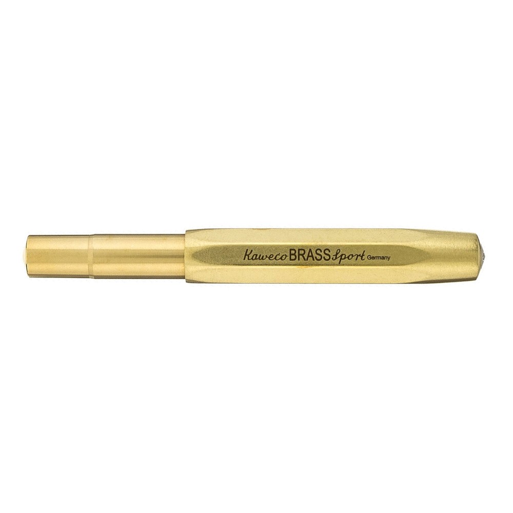 Ручки "Brass Sport" от немецкой компании Kaweco произведены из литой необработанной латуни, благодаря чему корпус со временем покрывается естественной патиной, на нем появляется уникальный узор. Их облик повторяет эксклюзивный дизайн Kaweco начала 20-го века, отличающийся оригинальной восьмигранной формой корпуса. Гравированное перо произведено из высококачественной нержавеющей стали. На корпусе сделана гравировка. Колпачок на резьбе, надёжно защищающий ручку, украшен на торце серебристым металлическим логотипом. В закрытом виде длина ручки составляет всего 10.5см, она легко помещается в небольшую сумку, барсетку или карман. Ручка выглядит компактно, но основательно и солидно, не создавая ощущение миниатюрности. В открытом состоянии ручка имеет длину - 13.5см, обеспечивая отличный баланс. Диаметр ручки в самом широком месте - 1.4см. Ручка идёт в комплекте с одним синим картриджем (International Short). Также в ручках серии "Sport" можно использовать мини-конвертер Kaweco. К ручке можно отдельно приобрести клип. ВАЖНО: от долгого контакта с чернилами металлические элементы ручки могут начать ржаветь. Не погружайте ручку в чернила и после работы удостоверьтесь, что на ручке не осталось чернил.